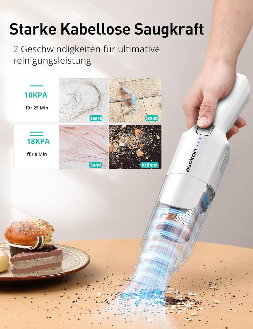 Aspiron Handstaubsauger Akku, 18000Pa & Schnellladestation, Starke Absaugung, HEPA-Filter, Akkusauge