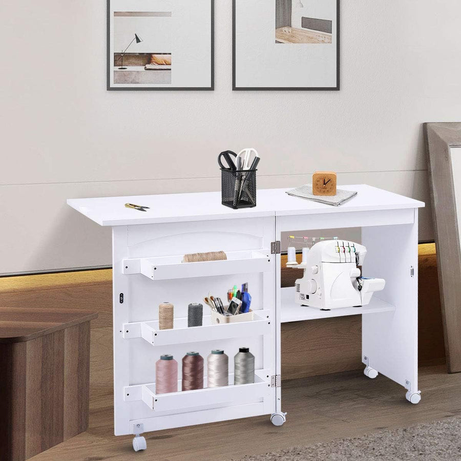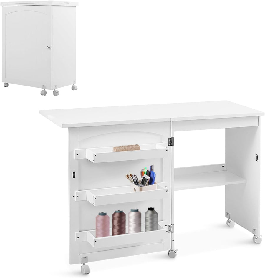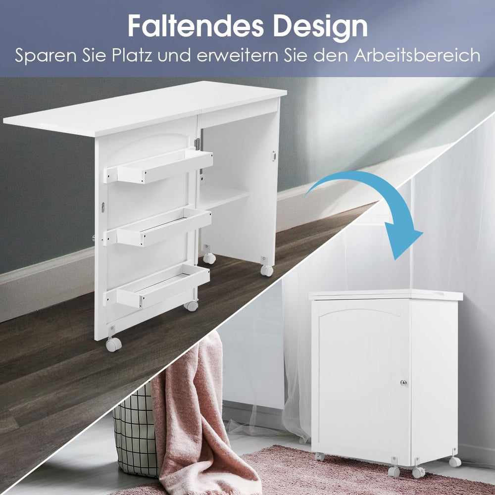 DREAMADE Nähtisch Nähmaschinenschrank Faltbar, Nähschrank Nähmöbel, Mehrzwecktisch mit 4 Rollen (Wei