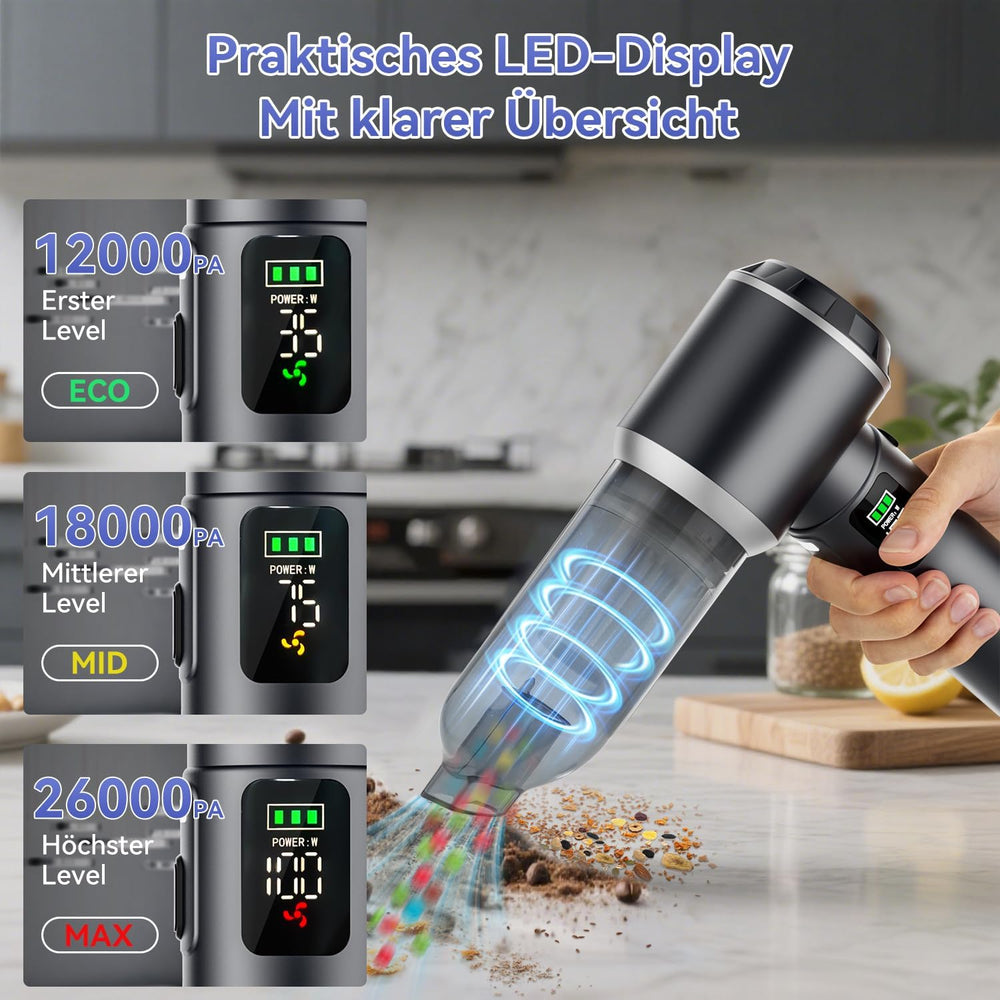 26000 Pa Kabelloser Handstaubsauger mit HEPA-Filter, LED-Display & LED-Licht, 4 in 1 Zubehör Leicht