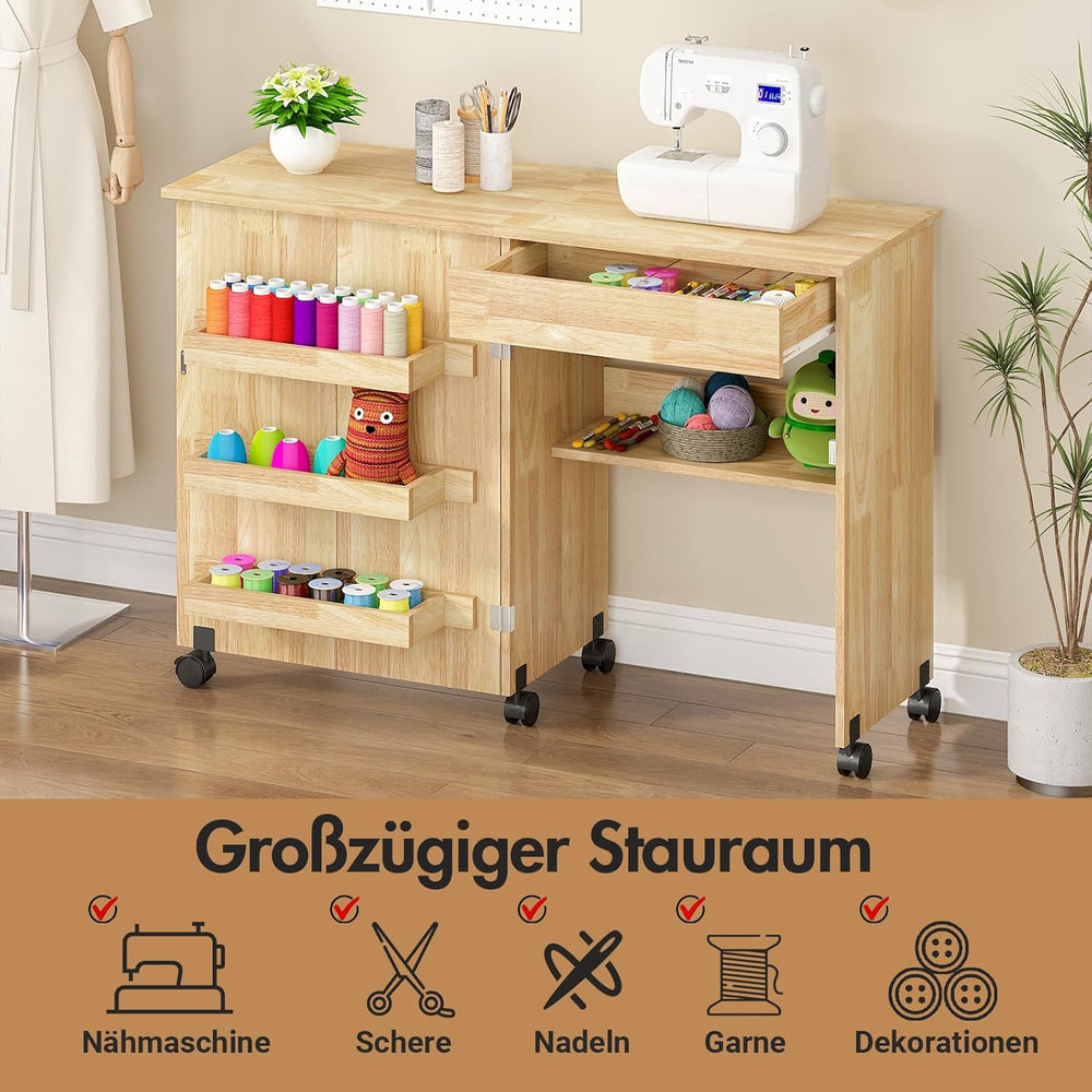 Nähtisch Klappbar, 2-in-1 Nähmaschinentisch, Nähmaschinenschrank mit Offenen Ablagefächern und Rolle