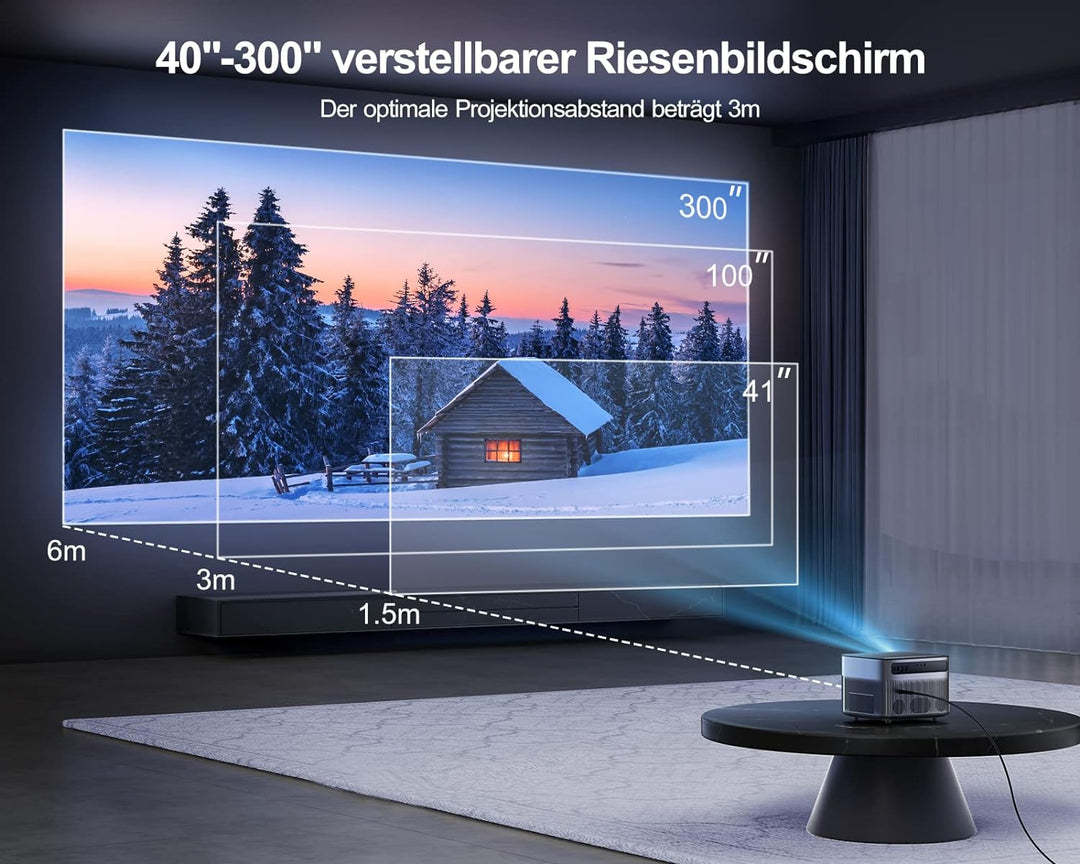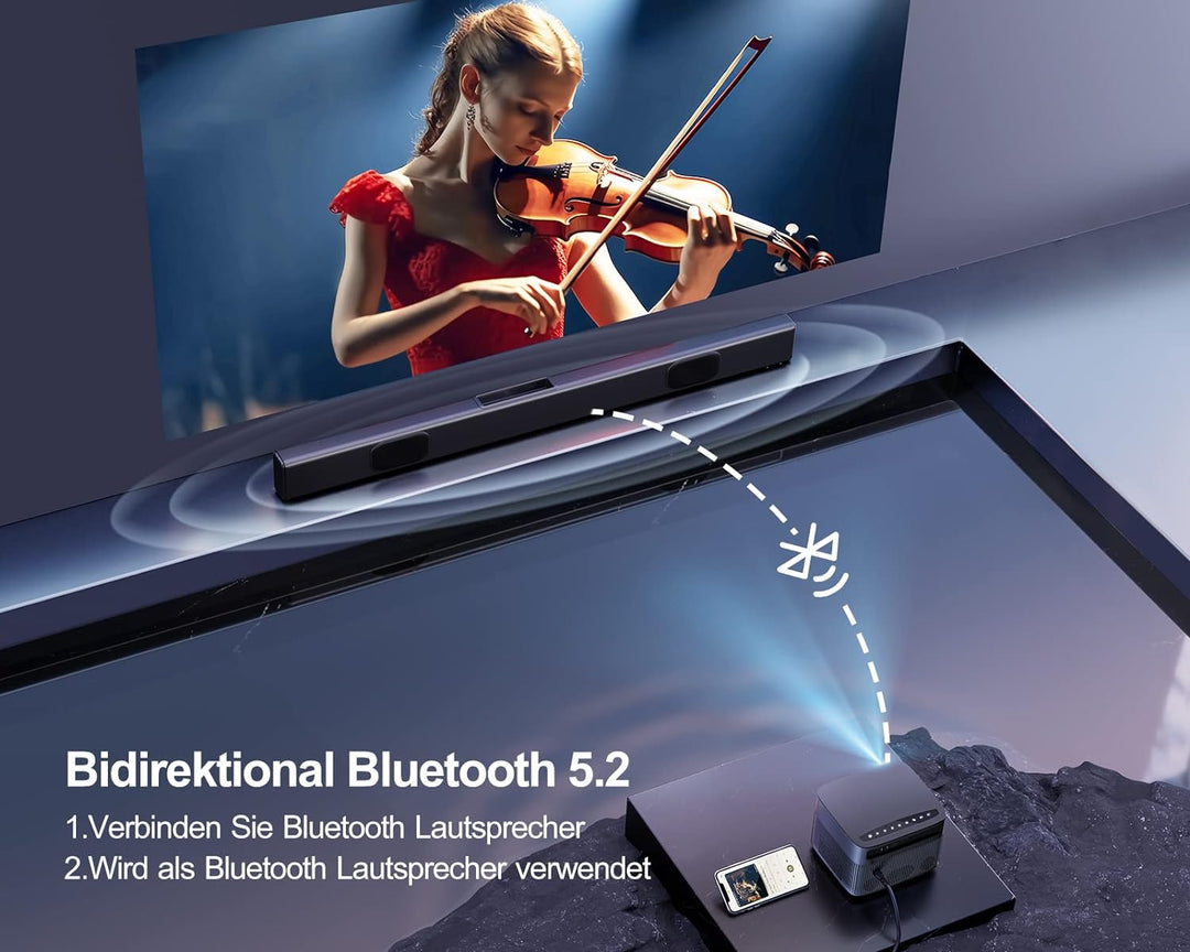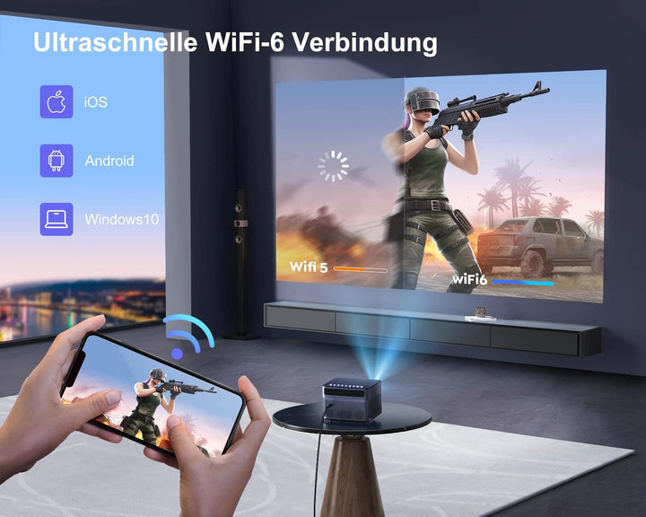 - 🛒【Ultraschneller WiFi6 & Bluetooth 5.1 Video Beamer】Zusätzlich zu 2,4G/5G WiFi verfügt dieser 4K Beamer über die neueste WiFi 6 Technologie, höhere Übertragungsrate und geringere Latenz, unterstützt iOS/Android/Windows 10 Geräte und kann