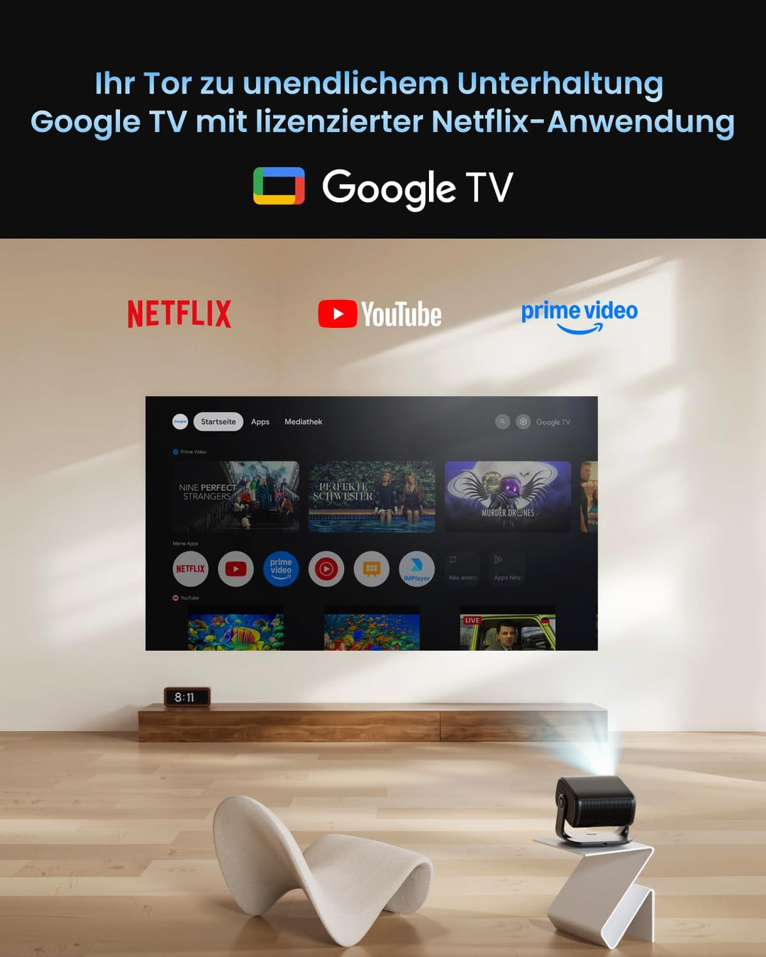 - Google TV mit offiziellem Netflix & nahtlosem Streaming: Geniessen Sie mühelose Unterhaltung mit dem integrierten offiziellen Google TV OS und zertifizierter Netflix-Unterstützung. Greifen Sie direkt vom Projektor auf Tausende von Apps wie Netflix,
