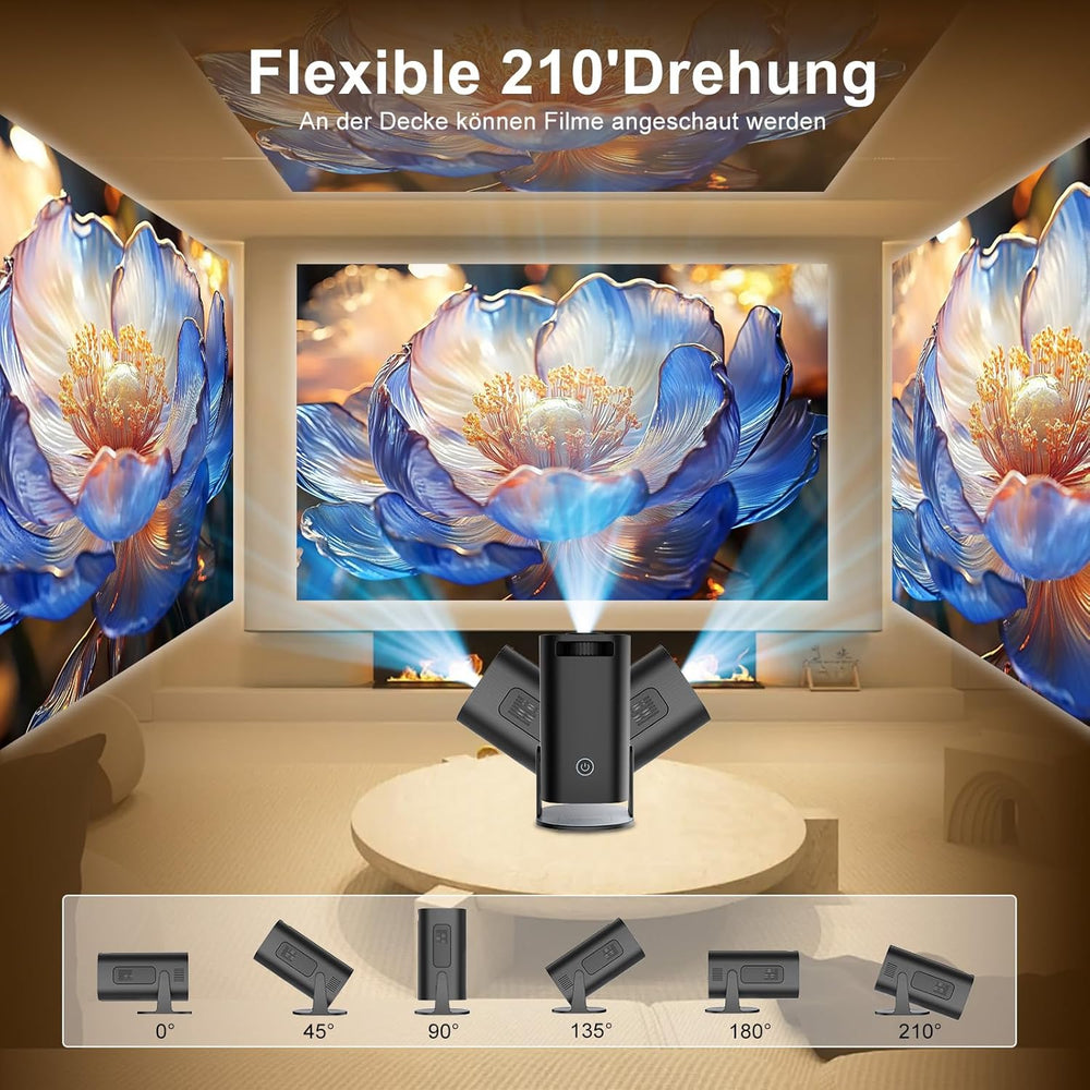 - 【210° drehbarer tragbarer Projektor】 Das innovative, um 210° drehbare Basisdesign durchbricht die traditionellen Projektionswinkelbeschränkungen und ermöglicht eine einfache Projektion an die Wohnzimmerwand oder Schlafzimmerdecke. Dank der