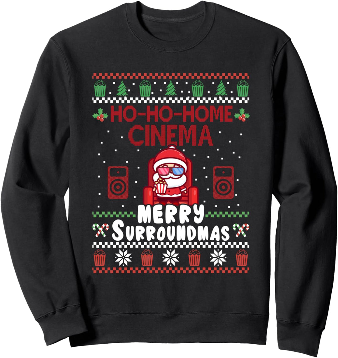 PRODUKTBESCHREIBUNGEN Für jeden Film-Nerd und Heimkinofan mit Surround Sound und Beamer im Kino zu Hause. Selbst an Weihnachten und den Feietagen willst Du nicht auf Kinofilme verzichten! Lustiges ugly Christmas Design mit Text "Ho-Ho-Home Cinema - Merry Surroundmas". Perfekte Geschenkidee für Männer und Frauen mit eigenem Heimkino. Dieses Heimkino und Film Fans für Kino und Serien ugly christmas Kleidungsstück ist von Lustige Weihnachten für Kinofans und Filmejunkies erstellt.