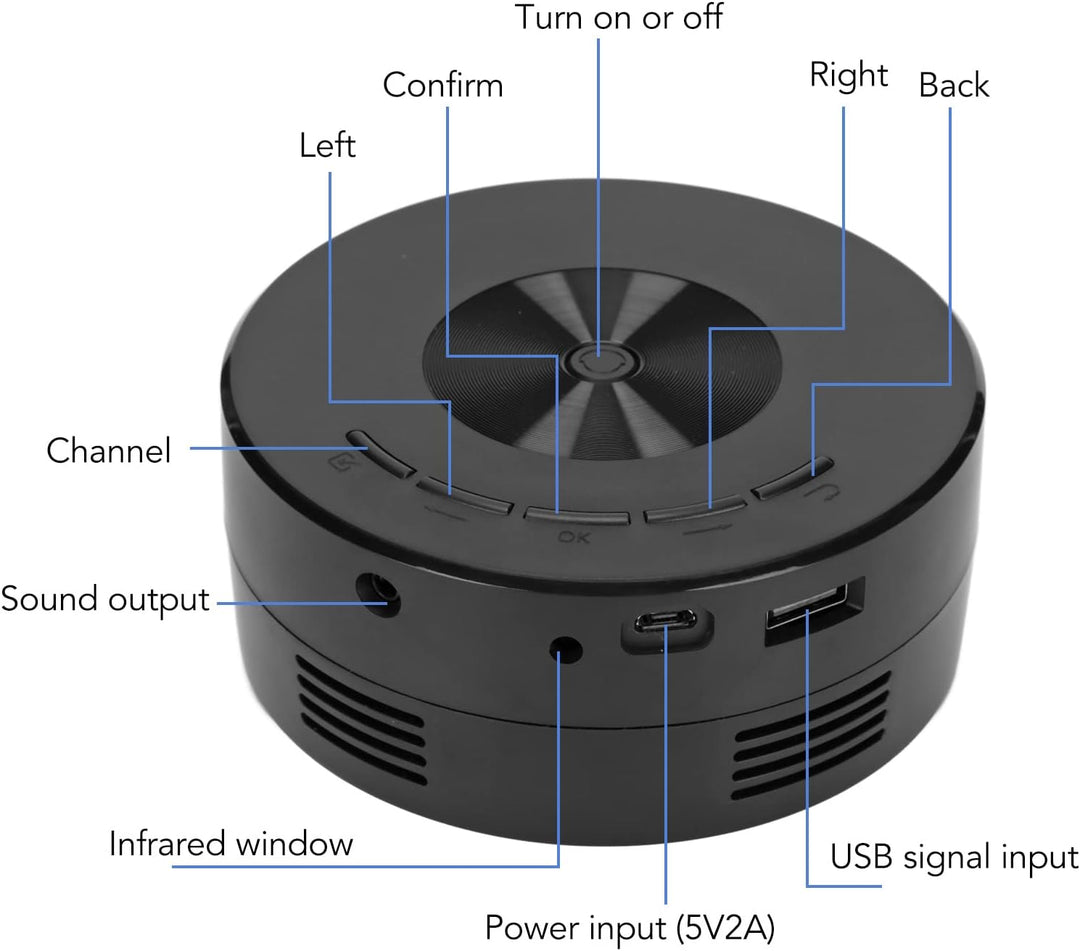 - Eingebauter Lautsprecher: Pocket-Kinoprojektor mit eingebauten 4Ω 2W-Lautsprechern, klarem Klang, externen Kopfhörern und Lautsprechern.