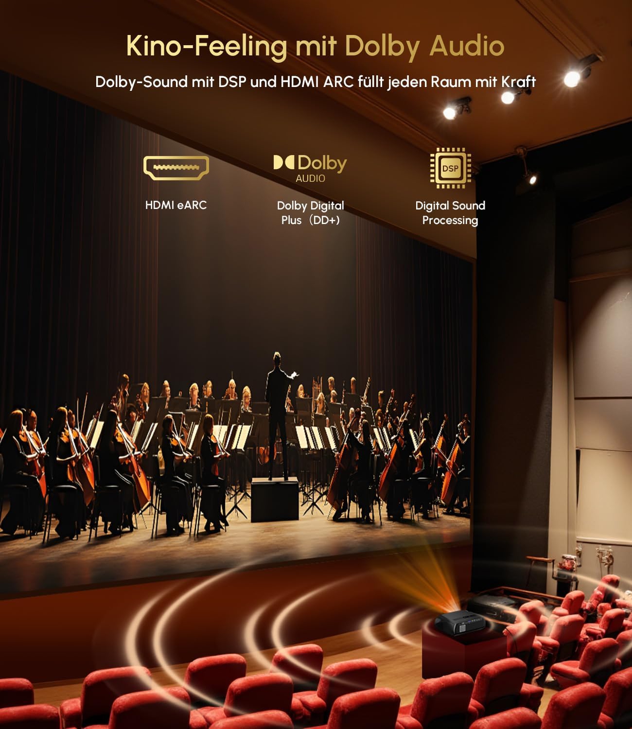 - [Kinostarkes Klangerlebnis: Kraftvoll und immersiv] Tauchen Sie ein in den Klang mit 38W-Lautsprechern, DSP und DD+. Dank DTS-HD MA & DTS:X Decoding sowie HDMI eARC bietet dieser Beamer mit Lautsprecher echtes Surround-Feeling – ob