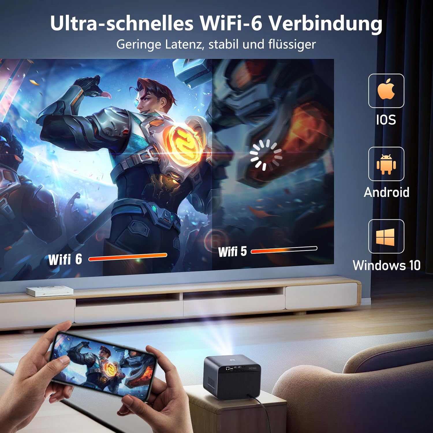 - Ultraschnelles Gigabit-Ethernet/WiFi6 und Bluetooth 5.2 - Dieser heimkino beamer innovativ nimmt Gigabit-Ethernet-Schnittstelle (RJ45/1000Mbps) und WiFi 6-Technologie, die niedrige Latenz und hohe Übertragungsrate bietet, und unterstützt die drahtlose