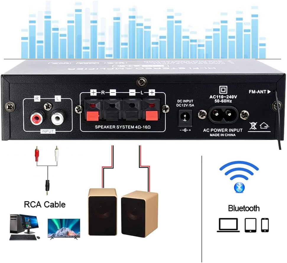 - 【Bluetooth5.0 & Fernbedienung】 Dieser Stereo-Verstärker unterstützt Wireless Bluetooth 5.0, einfach mit Smartphones, Tablets und anderen Bluetooth-Geräten direkt nach dem Einschalten des Geräts zu verbinden, es ist mit einer Fernbedienung kommen,