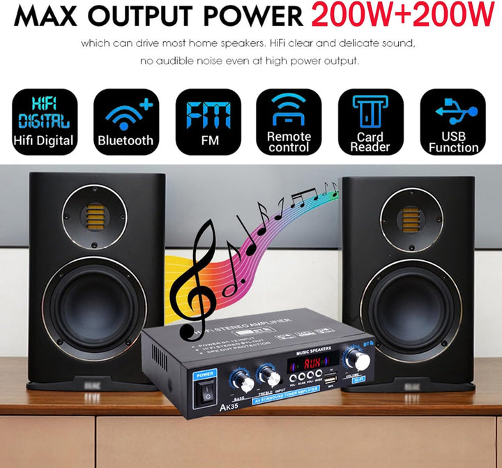 - 【Powerful Sound & Compact Size】AK35 Heim-Audio-Verstärker liefert 200W+200W Spitzenleistung und 30W+30W Nennleistung, perfekt geeignet für 4-16 Zoll passive Lautsprecher. Dieser Mini-Verstärker, der perfekt für Karaoke, Heimkino und akustische