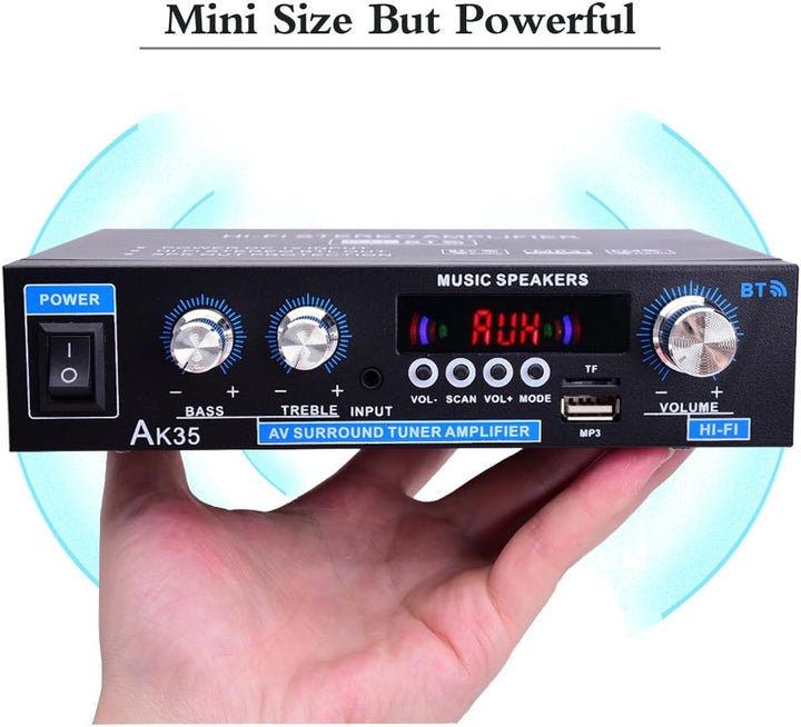 - 【Wide Application】 AK35 Verstärker Heim-Audio, mit Bluetooth, AUX, SD, USB-Eingang, Audio von externen Geräten, wie CD, DVD, TV, PC, Computer, Tablets, Notebooks, Telefone, MP3, und Projektoren mit AV-Audio usw., Mini-Grösse mit FM-Funktion, ideal