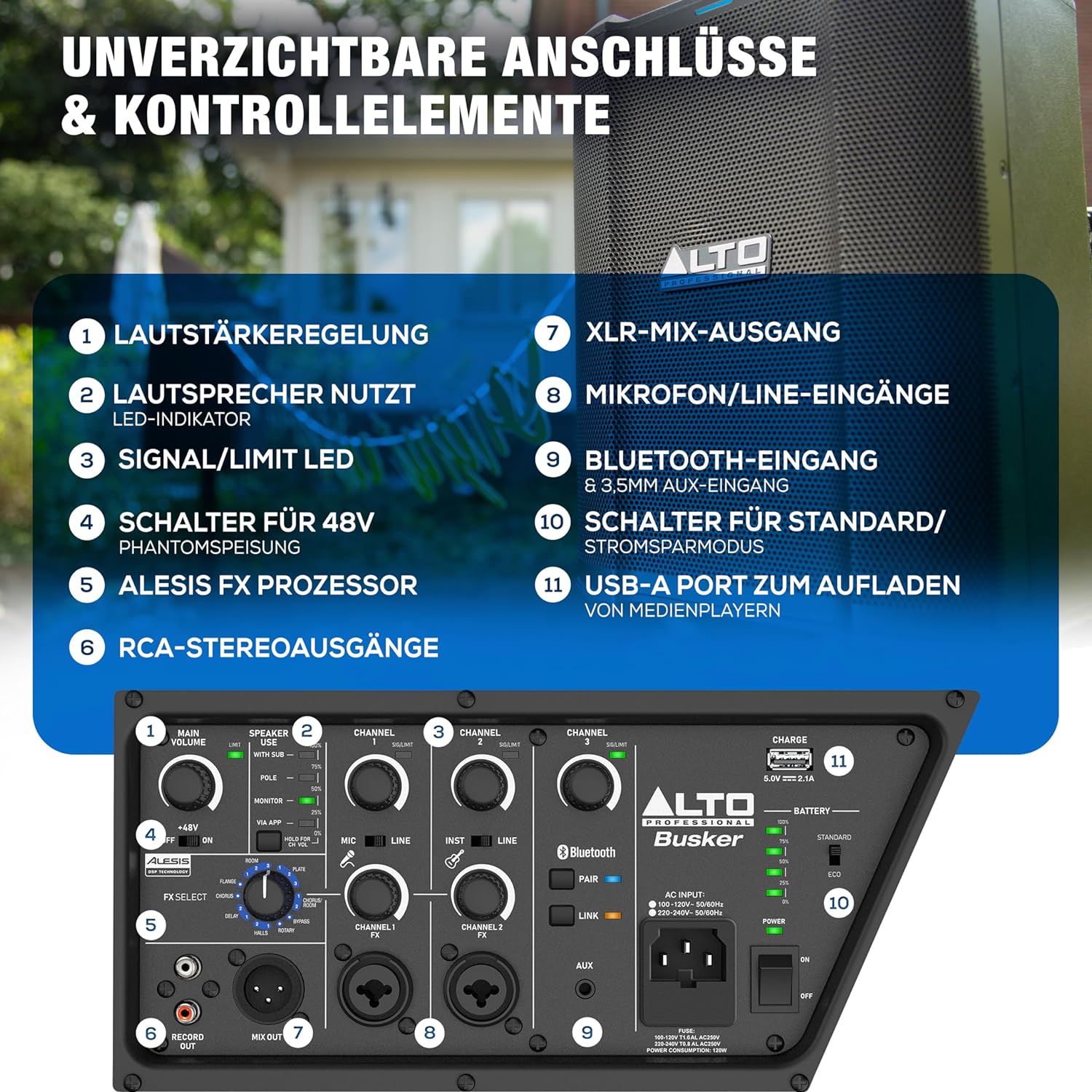 - Drahtlose Kontrolle - Mit Bluetooth 5.0 streamst du von jedem Gerät, koppelst zwei Busker für PA Stereostreaming oder kontrollierst Mixing, Effektpegel und EQ über die Alto Pro App