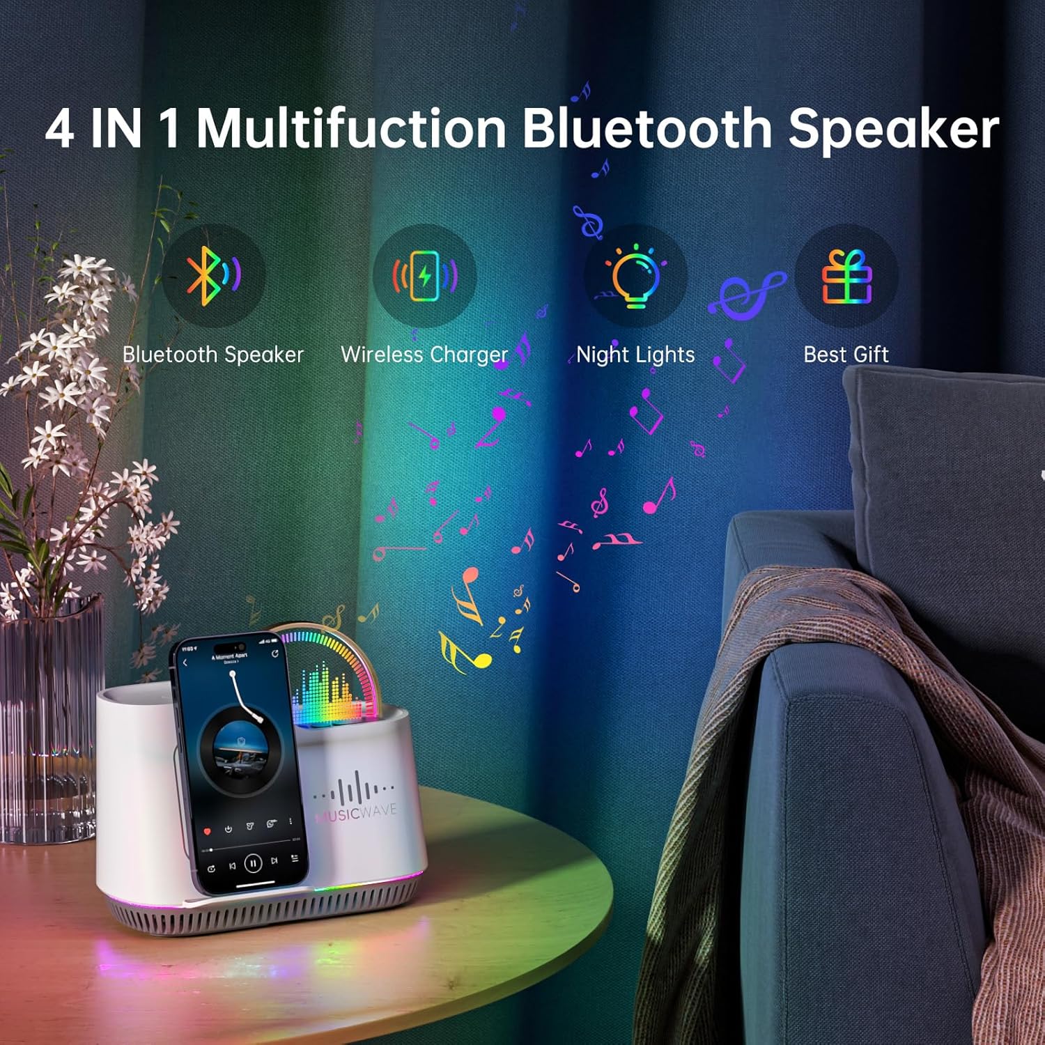 - [2025 Upgrade 5 in 1 Multifunktional] 5.4 HiFi Bluetooth Lautsprecher+Induktive Ladestation+Led Nachtlicht Dimmbar+Telefonhalter+Freisprechen! Dank des eingebauten Mikrofons können Sie beim Kochen oder Baden Anrufe direkt über diesen bloototh