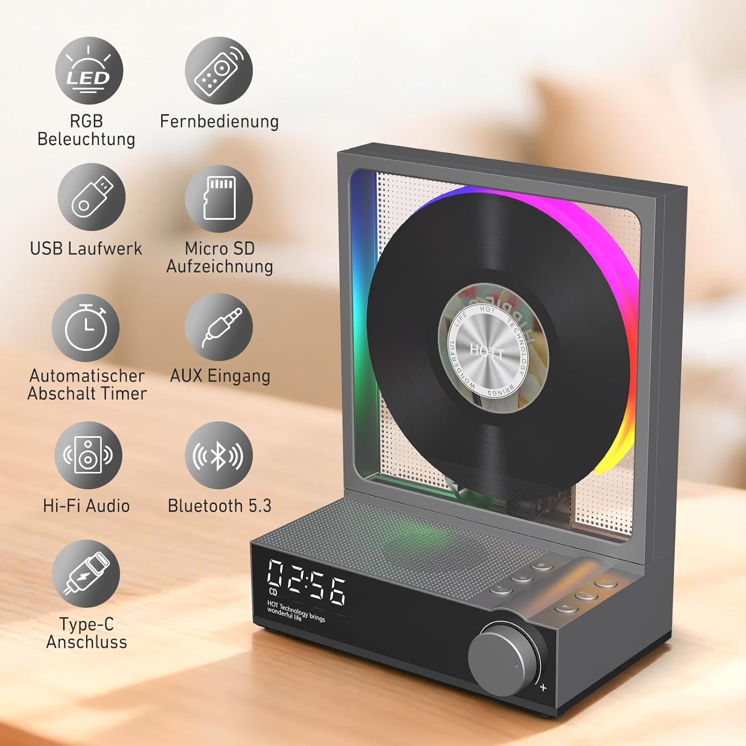 - 【Exquisites Design mit RGB-Beleuchtung】Der neueste dreidimensionale Desktop-CD-Player verfügt über ein vollständig transparentes magnetisches CD-Fach und ist mit einem hochwertigen Drehschalter ausgestattet. In Kombination mit den farbenfrohen