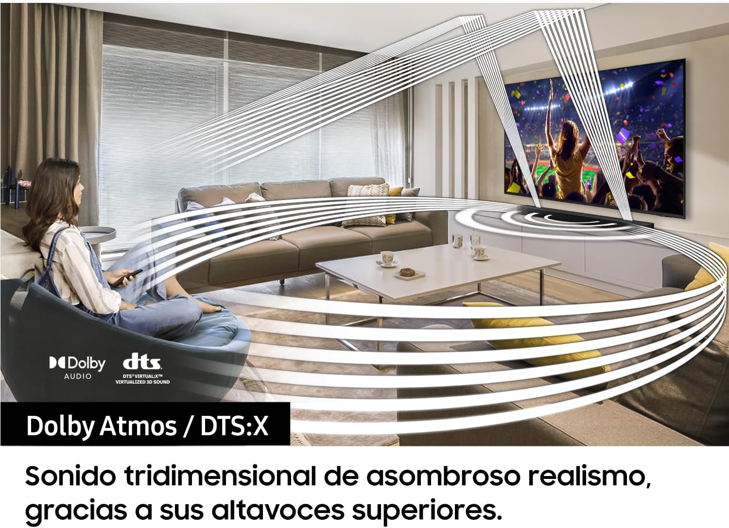 - Soundbar SAMSUNG Q-Serie mit 9 Lautsprechern, Dolby Atmos und DTS:X für kraftvollen 3D-Sound aus jeder Richtung, kompatibel mit der Fernbedienung des SAMSUNG TV zur Einstellung von Leistung und Lautstärke, kabellose Verbindung zwischen Soundbar und TV