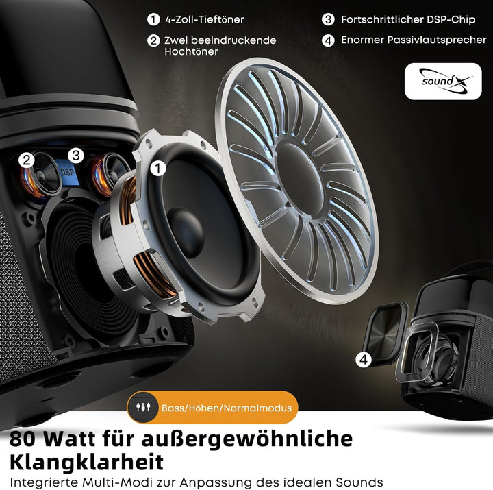 - 【Klare und makellose Klangqualität】Dieser tragbare Bluetooth-Lautsprecher verfügt über den neuesten DSP-Chip und die SoundX-Akustikverarbeitungstechnologie, die reichen und klaren Klang mit bemerkenswerter Klarheit liefert. Eingebaute Bass-,