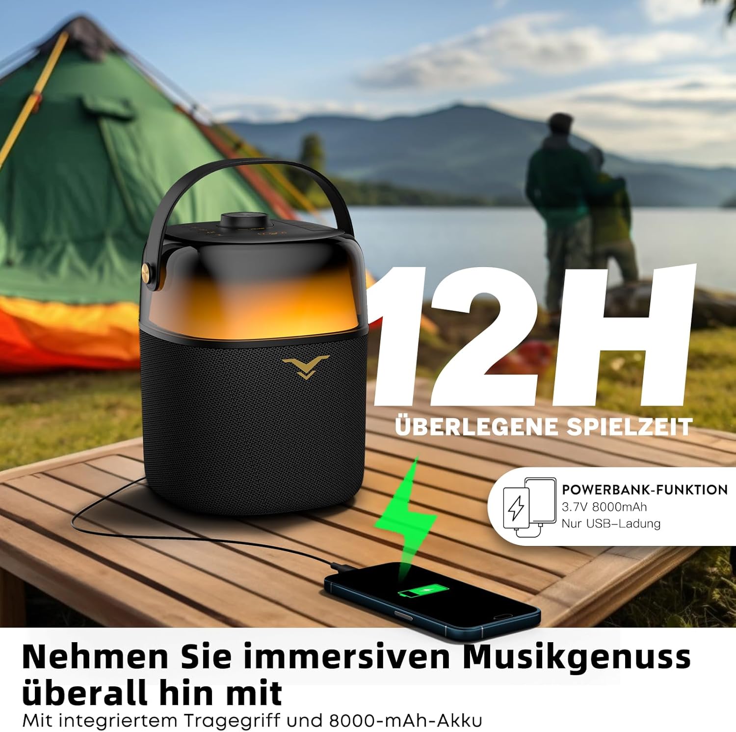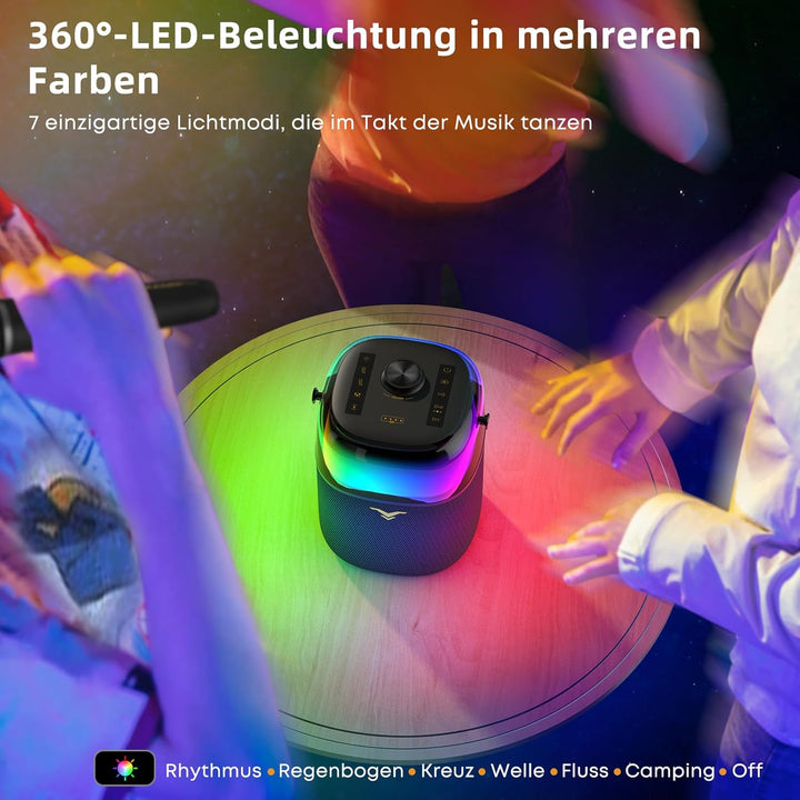 - 【360° Mehrfarbige LED-Lichter】Dieses tragbare PA-System verfügt über dynamische 360° Mehrfarbige LED-Lichter für ein immersives Erlebnis, gestaltet mit 6 RGB-Beleuchtungsmodi - Rhythmus, Regenbogen, Kreuz, Welle, Fluss und Campinglichter, die