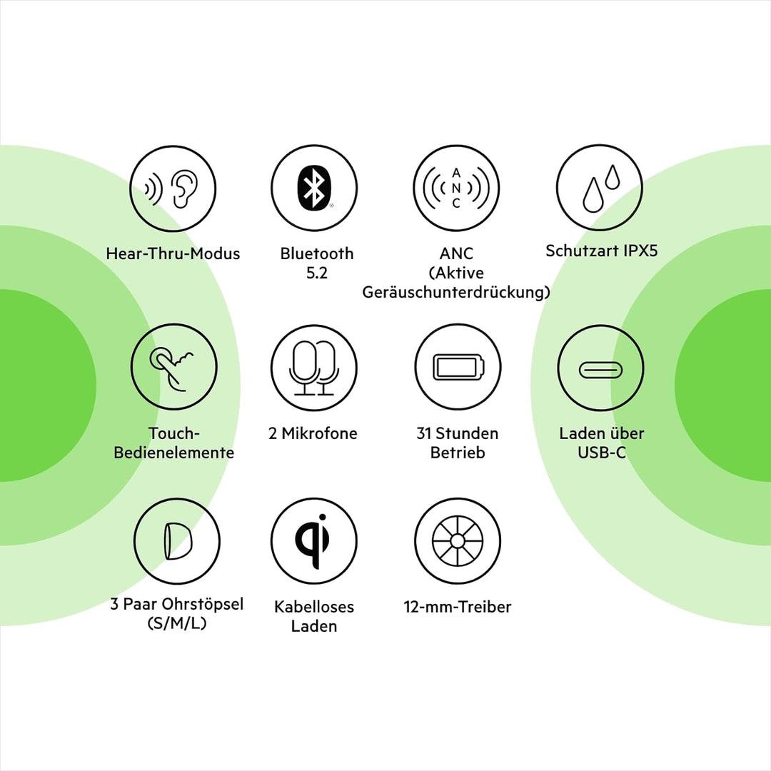- Touch-Bedienelemente ermöglichen einen echten Mono-Modus in jedem Ohrhörer, ohne Kabel und Knöpfe. Dank des Hearthru-Modus können Sie auf Umgebungsgeräusche achten.