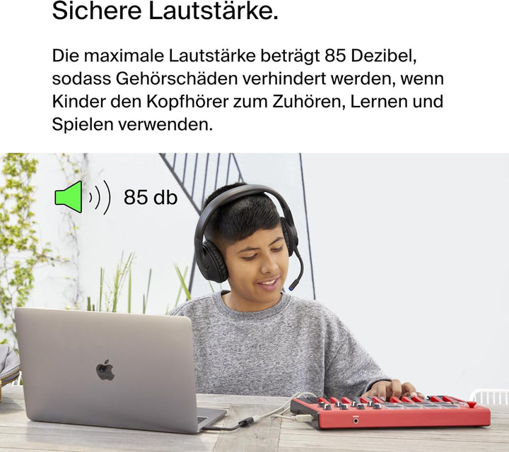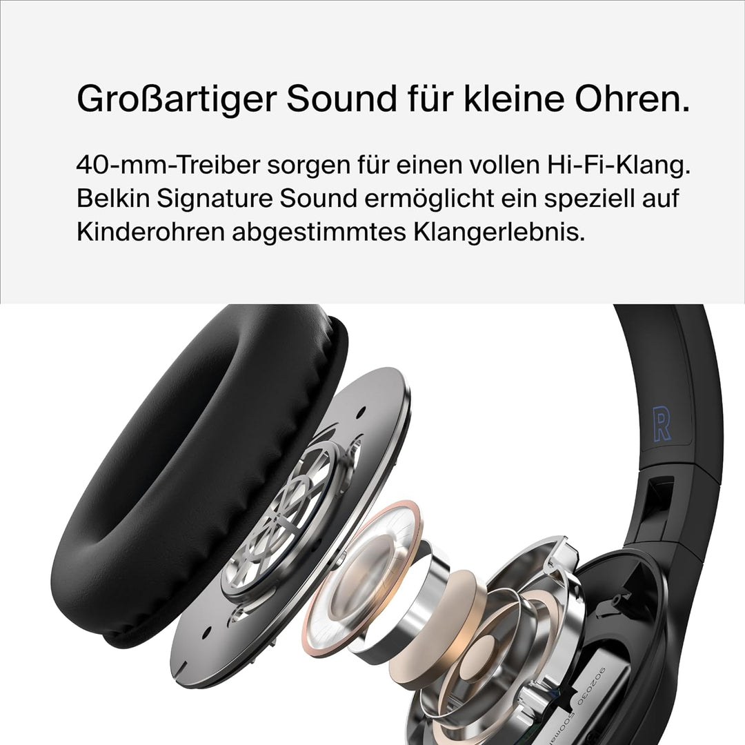 - SICHERE LAUTSTÄRKE FÜR KINDER: Der Belkin Signature Sound sorgt für ein speziell auf Kinderohren abgestimmtes Klangerlebnis. Zum Schutz der Ohren hat das Headset eine Lautstärkebegrenzung von 85 dB. 40-mm-Treiber sorgen für einen klaren Hi-Fi-Sound.