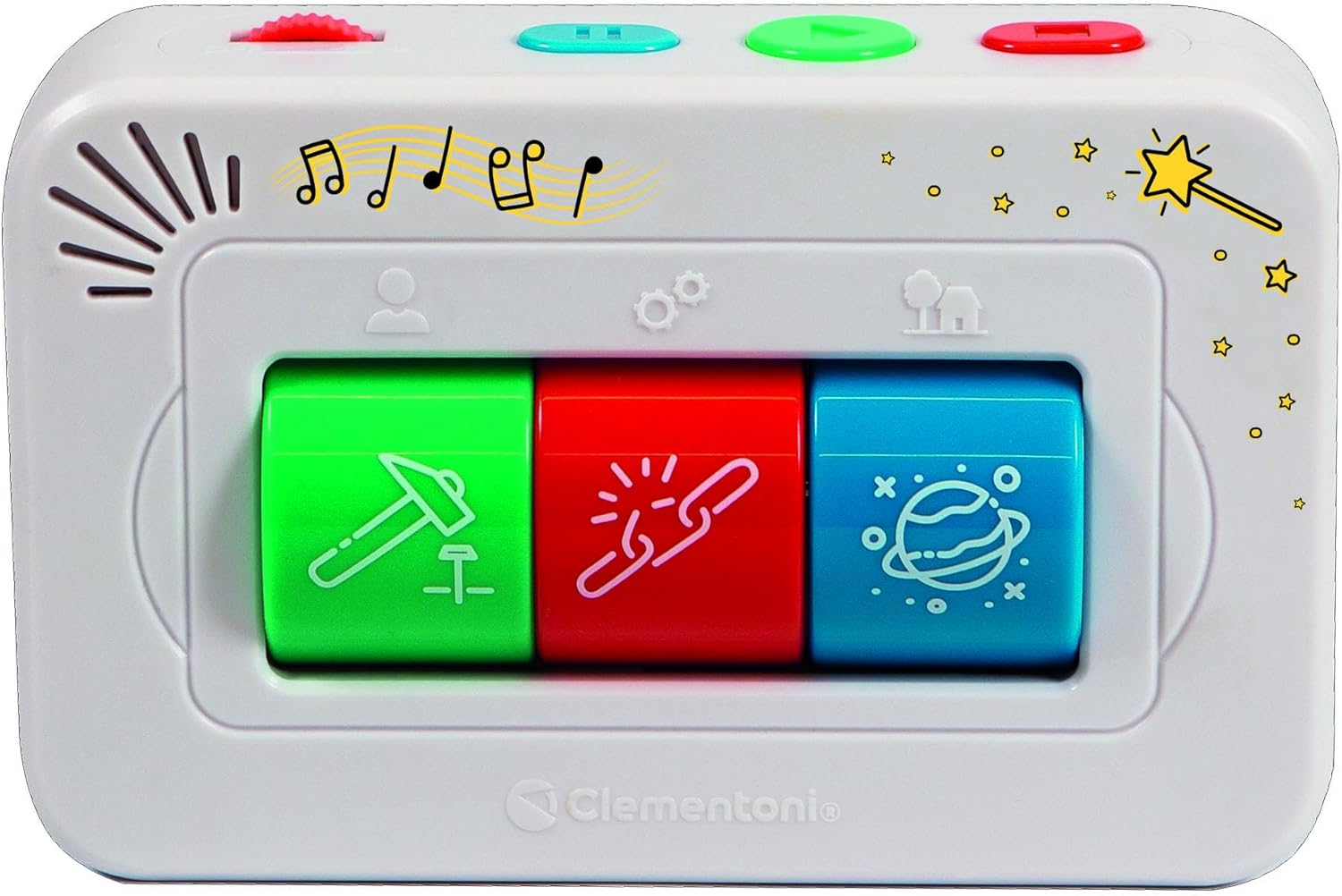 - Ein interaktiver Geschichtenerzähler zum Erstellen und Hören von 64 Geschichten, deren Elemente jedes Mal unterschiedlich kombiniert werden können. Das Kind kann die 3 Rollen drehen, um den Charakter, den Ort und das Thema zu entscheiden.