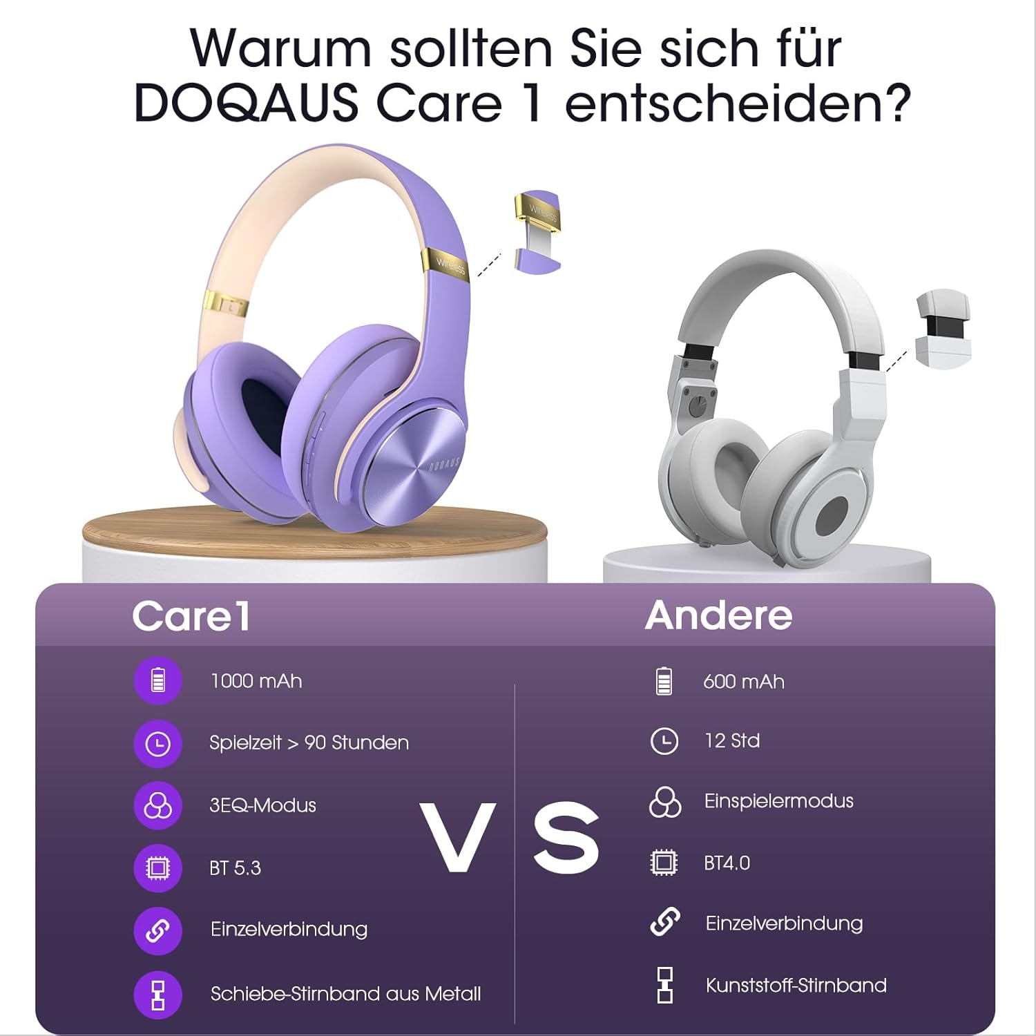 - 【Optimierte Klangqualität mit 3-EQ-Modi】 DOQAUS ist stets auf dem Laufenden, um bessere Klangeffekte und ein besseres Hörerlebnis zu erzielen. Ein grosser Schritt, den DOQAUS getan hat: DOQAUS Care 1 Over Ear Kopfhörer Bluetooth verfügen über 3