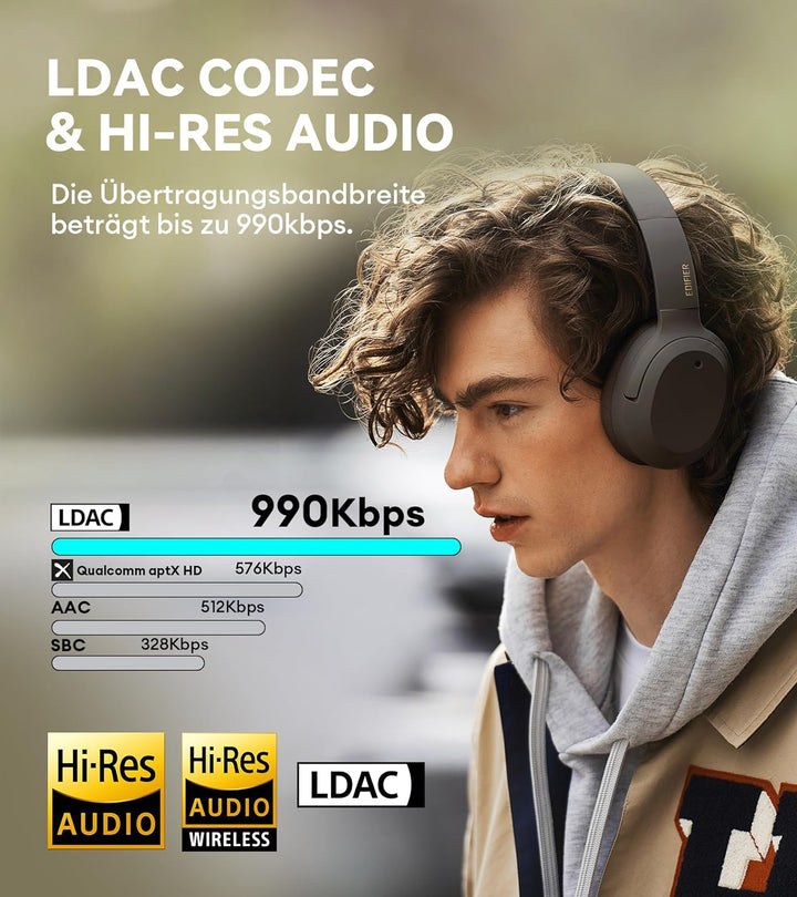 - 🎧Hohe Klangqualitä🎧 Ausgestattet mit einer grossen 1,6 Zoll (40 mm) Mäntelplatte aus Verbundmembran, die LDAC-Dekodierung und hohe Auflösung unterstützt und Ihnen mehr Musikdetails liefert. Vergleich der Übertragungsgeschwindigkeit: LDAC 990