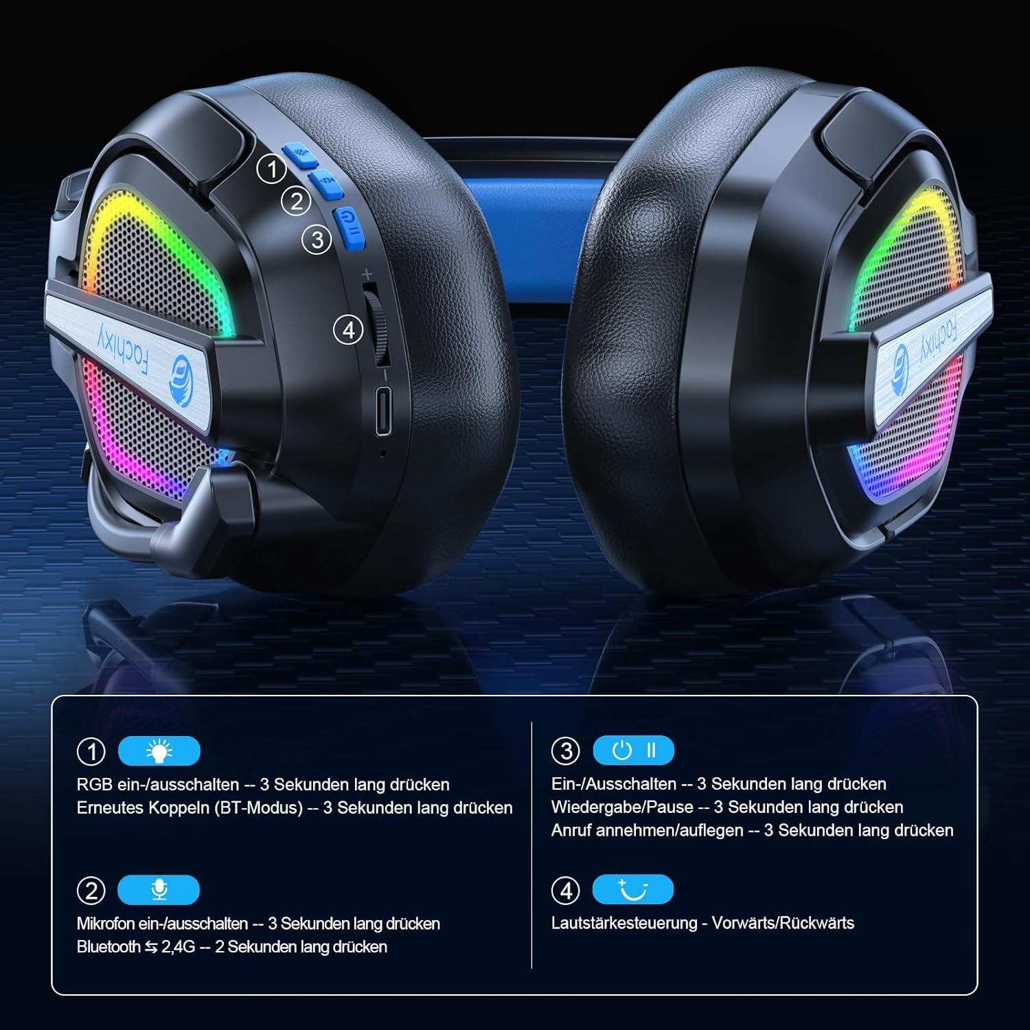 - âšăWeiche RGB-BeleuchtungăDas Fachixy Wireless Headset ist mit einem coolen RGB-Beleuchtungsdesign ausgestattet. Nach dem Einschalten mit der On/Off-Taste Ă€ndert sich der LED-Lichteffekt dynamisch mit dem Spiel.Bringen Sie Ihre LED-RGB-Fantasien