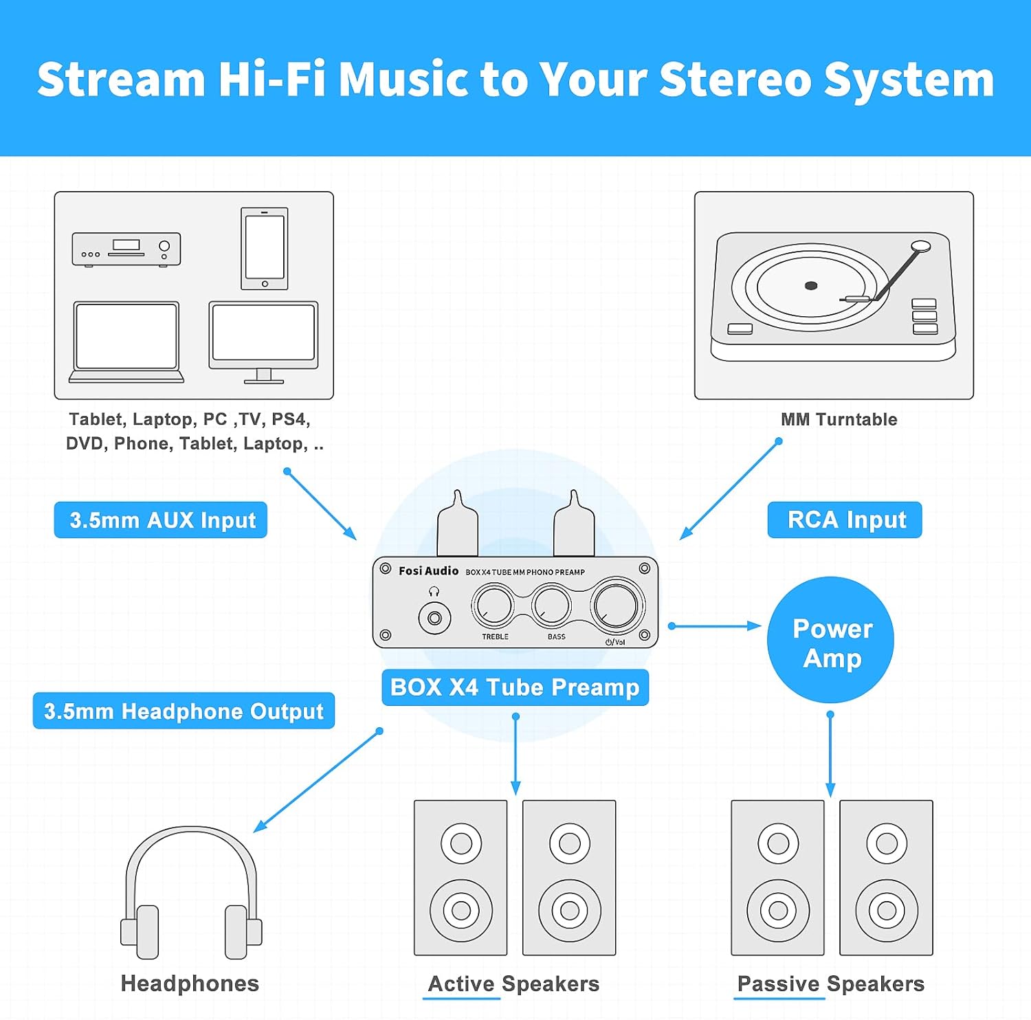- JAN 5654W Röhren-MM-Phono-Vorverstärker: Der BOX X4 Phono Vorverstärker unterstützt 3,5-mm-AUX- und MM-Plattenspieler-Eingänge und wandelt Phono-Signale in Line-Pegel-Signale mit rauscharmen integrierten Schaltkreisen und hochwertigen Komponenten