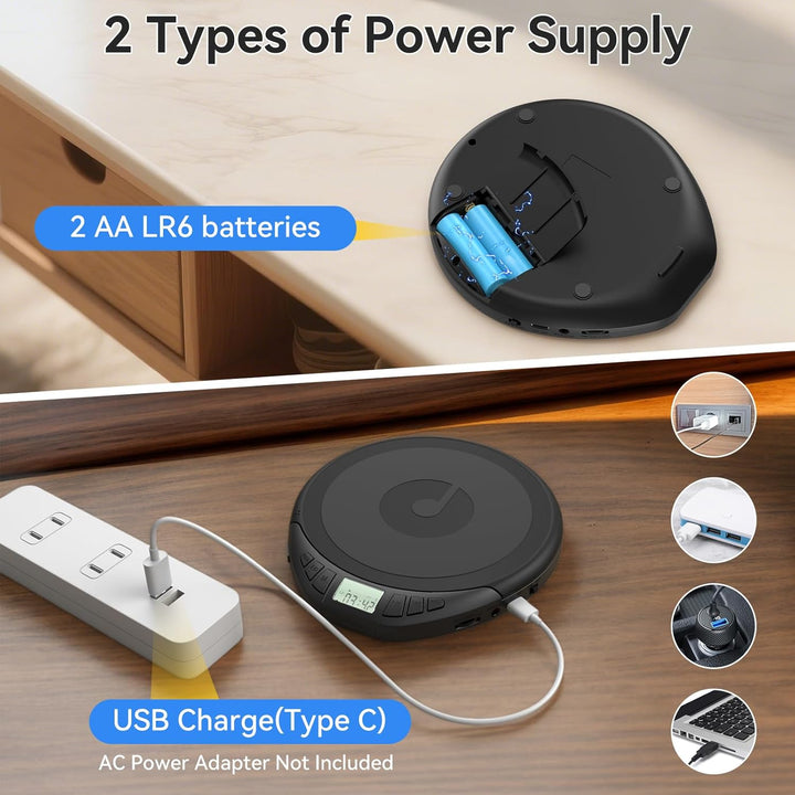 - [Stromversorgung] Zu Hause können Sie den CD-Player mit dem Typ-C-Kabel im Handumdrehen einwandfrei einstellen; Wenn Sie draussen sind, müssen Sie sich keine Sorgen um Stromquellen machen, da 2 x LR6 Batterien (NICHT INBEGRIFFEN); Wenn Sie es in Ihrem