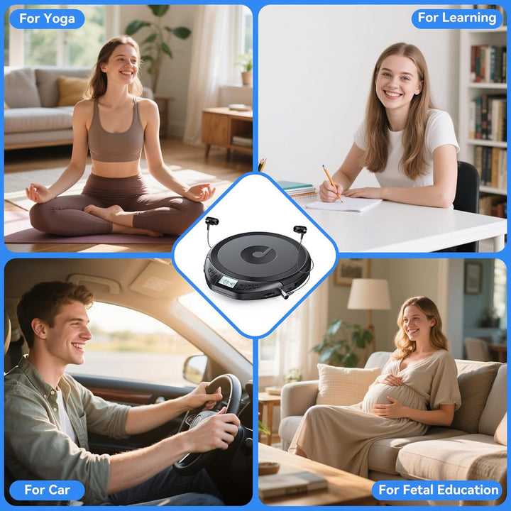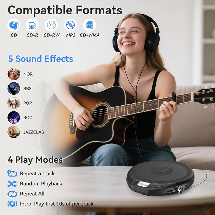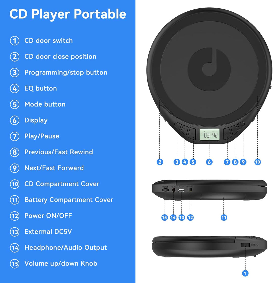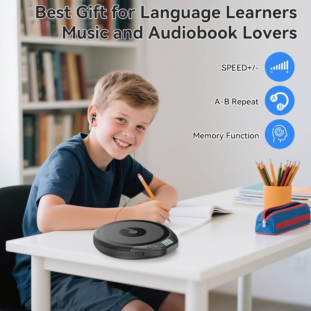 - [Anti-Skip & Wiederholung] Die erweiterte Anti-Skip-Funktion stellt sicher, dass der CD-Player nicht aufhört zu spielen, selbst wenn er zittert, stösst oder sich bewegt. Es kann auch schnelle Vorwärtsspuren und A-B-Wiederholung spezifische Spuren