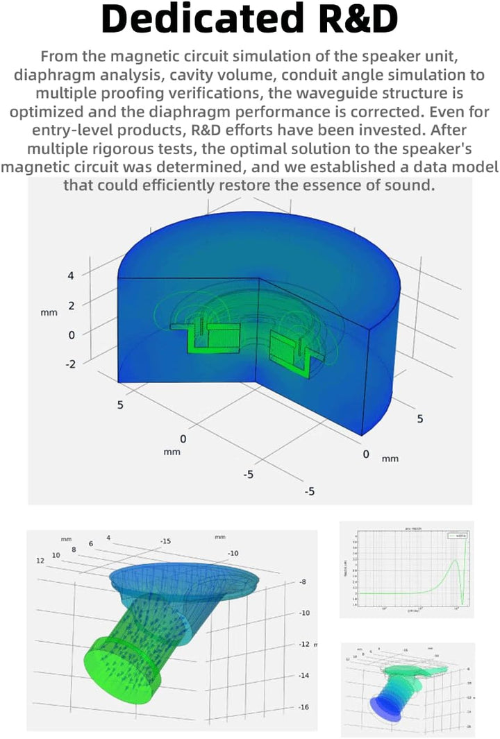 - 【Fokus auf Forschung und Entwicklung】 Von der Simulation des magnetischen Schaltkreises der Lautsprechereinheit, der Membrananalyse, dem Hohlraumvolumen, der Simulation des Leitungswinkels bis hin zur mehrfachen Proofing-Überprüfung wird die