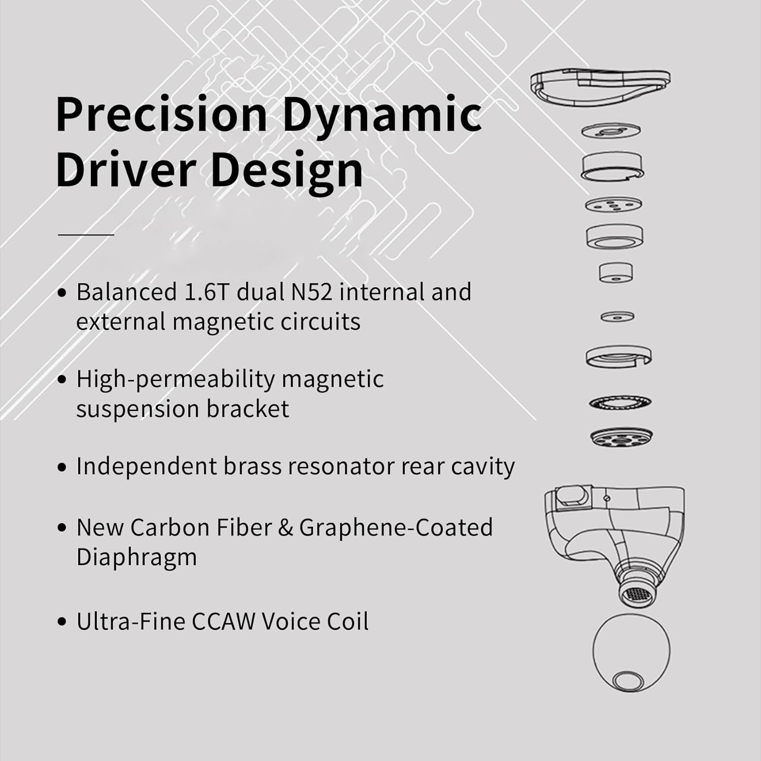 - Präzises dynamisches Treiberdesign: Die dynamische Spule dieses Kopfhörers verfügt über einen ausgewogenen 1,6T Dual N52 internen und externen Magnetkreis, eine Aufhängung für einen hochmagnetischen Durchlässigkeitsmechanismus, einen unabhängigen