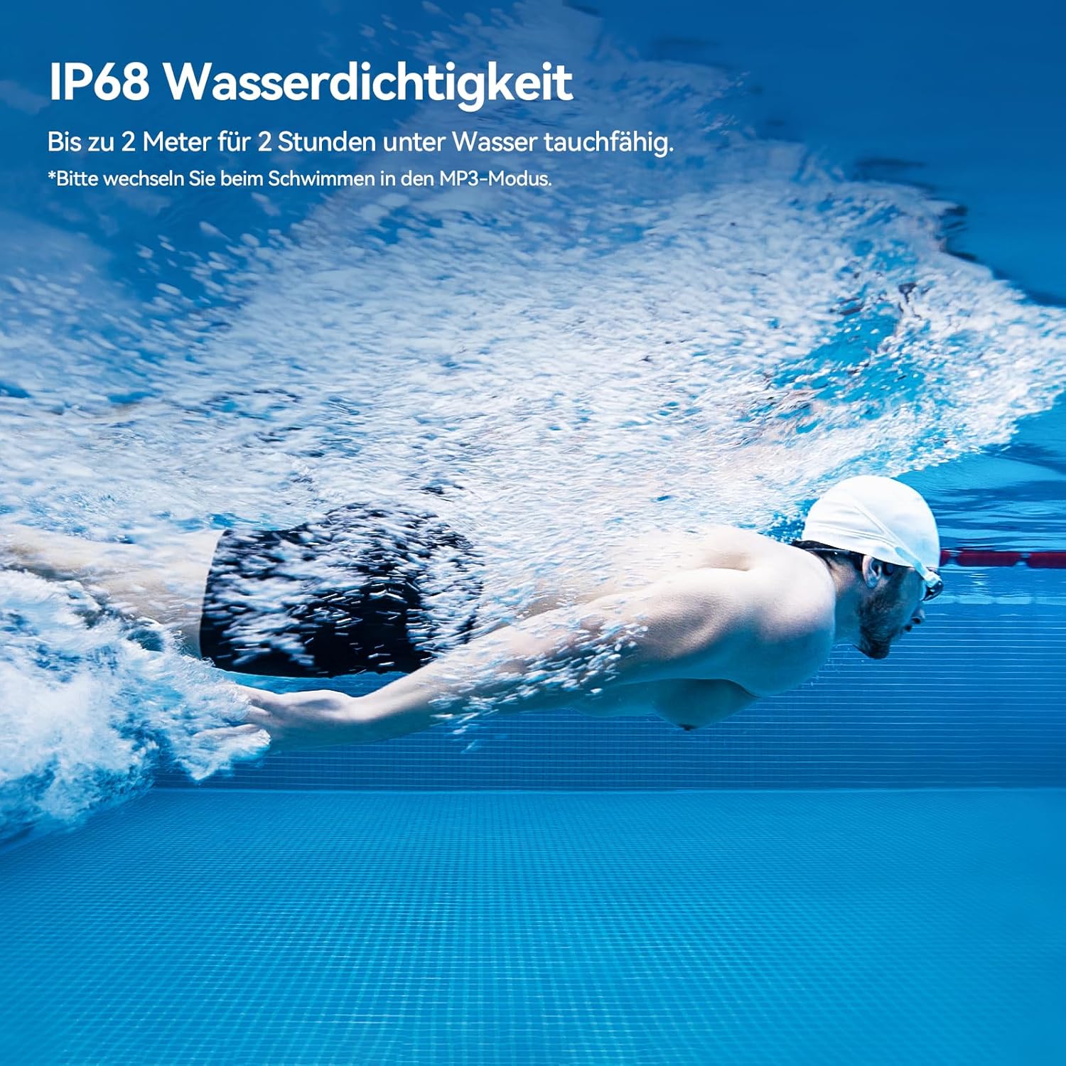 - 【IP68 Wasserdicht】 Die Bluetooth-Kopfhörer sind IP68 wasserdicht und können bis zu 2 Stunden unter Wasser 2 Meter unter Wasser getaucht werden. Der integrierte MP3-Player von Run Plus und die Kompatibilität mit Badekappen und Schutzbrillen machen