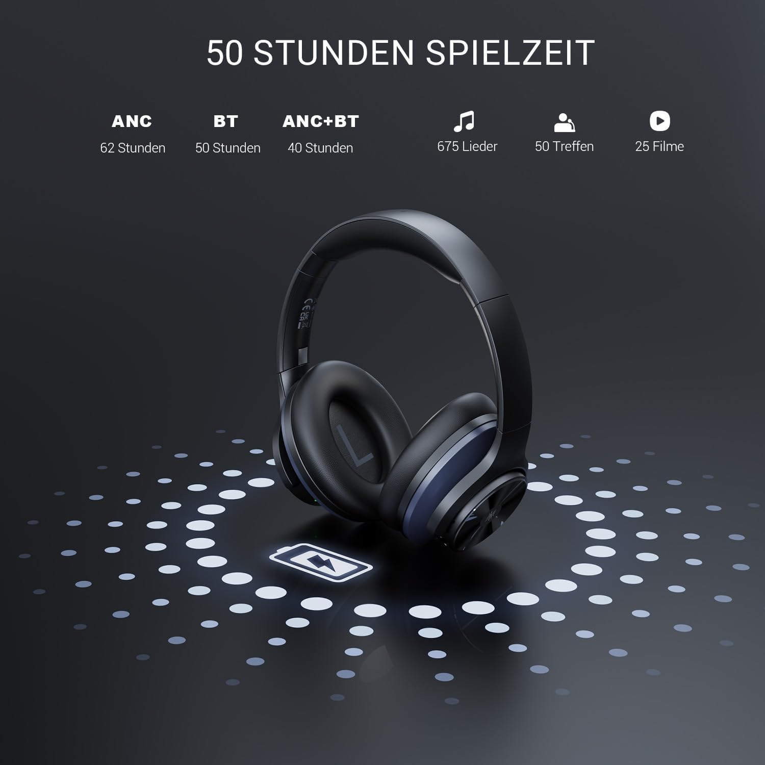 - 【62-Std ultralange Akkulaufzeit】Die Kopfhörer verfügen über eine leistungsstarke Batteriekapazität, die es Ihnen ermöglicht, Ihre eigene Musikwelt in verschiedenen Modi zu geniessen. Geniessen Sie bis zu 62 Stunden Musik, Filmwiedergabe oder