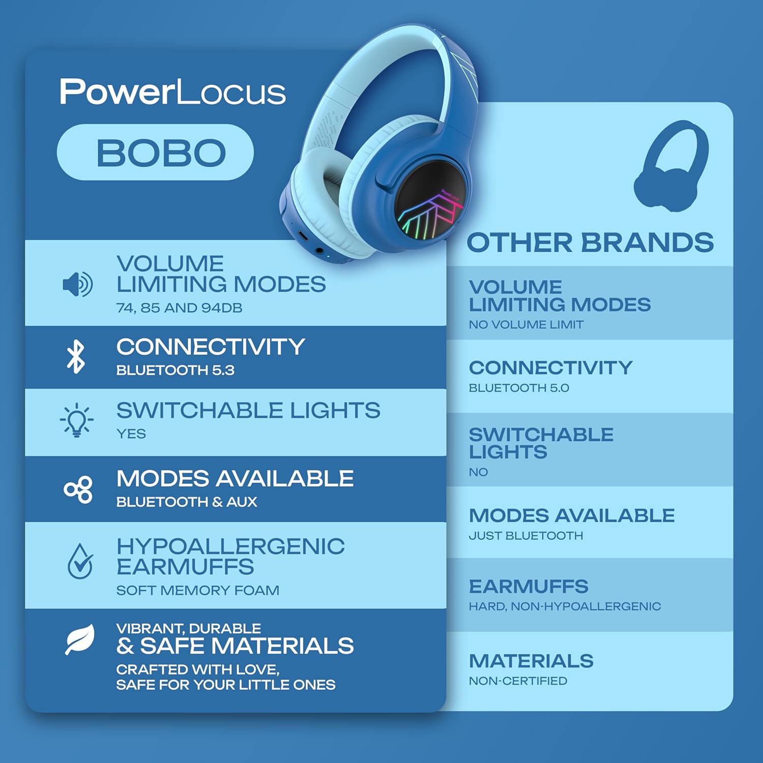 - 【Dreifache Lautstärkenbegrenzung】- Sichere drahtlose Kopfhörer für Kinder mit Lautstärkenbegrenzung, die ein ungefährliches und kontrolliertes Hörerlebnis garantieren. Sie können sich darauf verlassen, dass der PowerLocus Bobo Over Ear