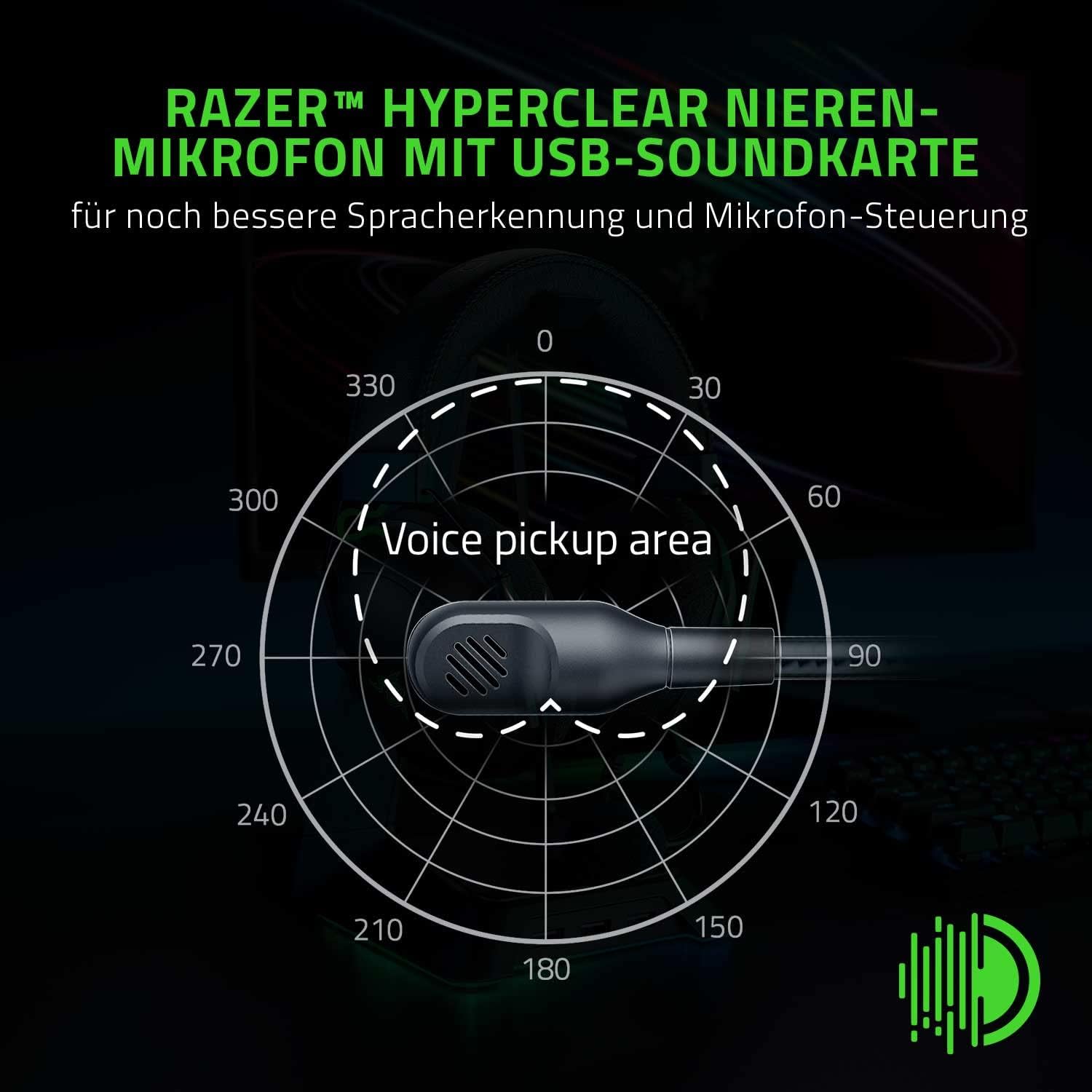 - RAZER HYPERCLEAR NIEREN-MIKROFON MIT USB-SOUNDKARTE Für noch bessere Spracherkennung und Mikrofon-Steuerung Dank extra Feinabstimmung nimmt das abnehmbare Mikrofon des Headsets nur die eigene Stimme auf, und mit der USB-SoundKarte lässt sich über Razer Synapse die Sprachausgabe noch weiter optimieren.
