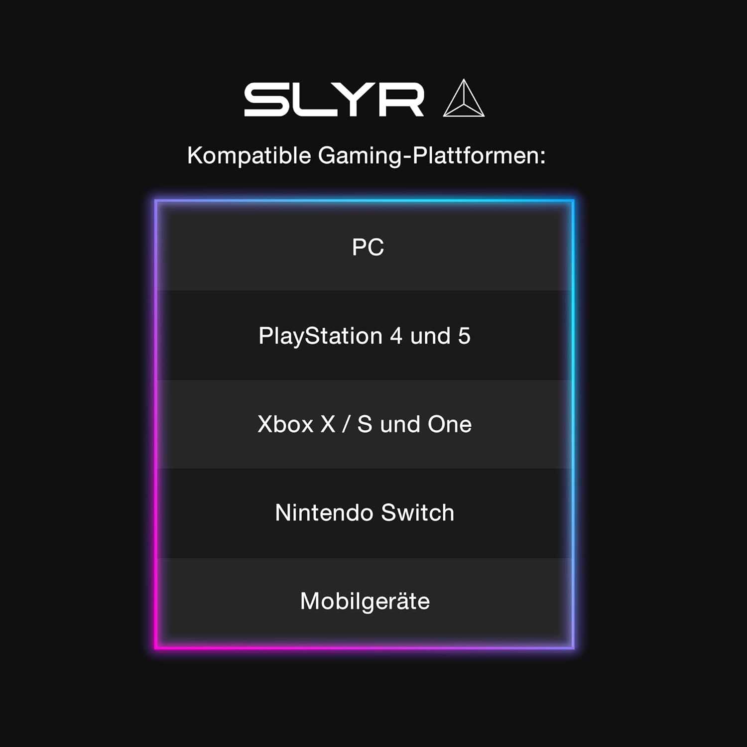 - Multi-Plattform-Kompatibilität – Der SLYR sorgt für kristallklaren Sound am PC, auf PlayStation, Nintendo Switch und Xbox sowie auf Mobilgeräten und mehr. Und mit seinem 3,5-mm-Audiokabel ist er der Inbegriff von Plug-and-Play.