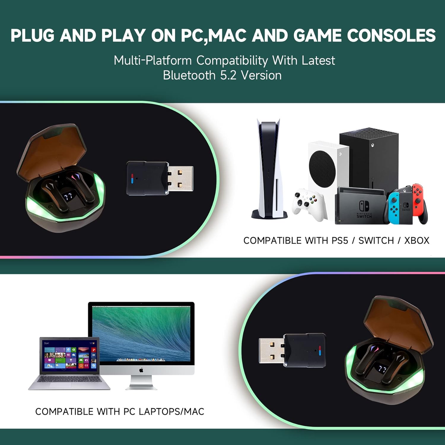 - 【Plug and Play auf PC, PS4, PS5 und Switch】 Sontinh AlienBuds sind einfach zu installieren und zu verwenden. Nach dem ersten Einrichten verbinden sich die Alienbuds automatisch über den exklusiven USB-Dongle.(unterstützt im Moment keine Xbox)