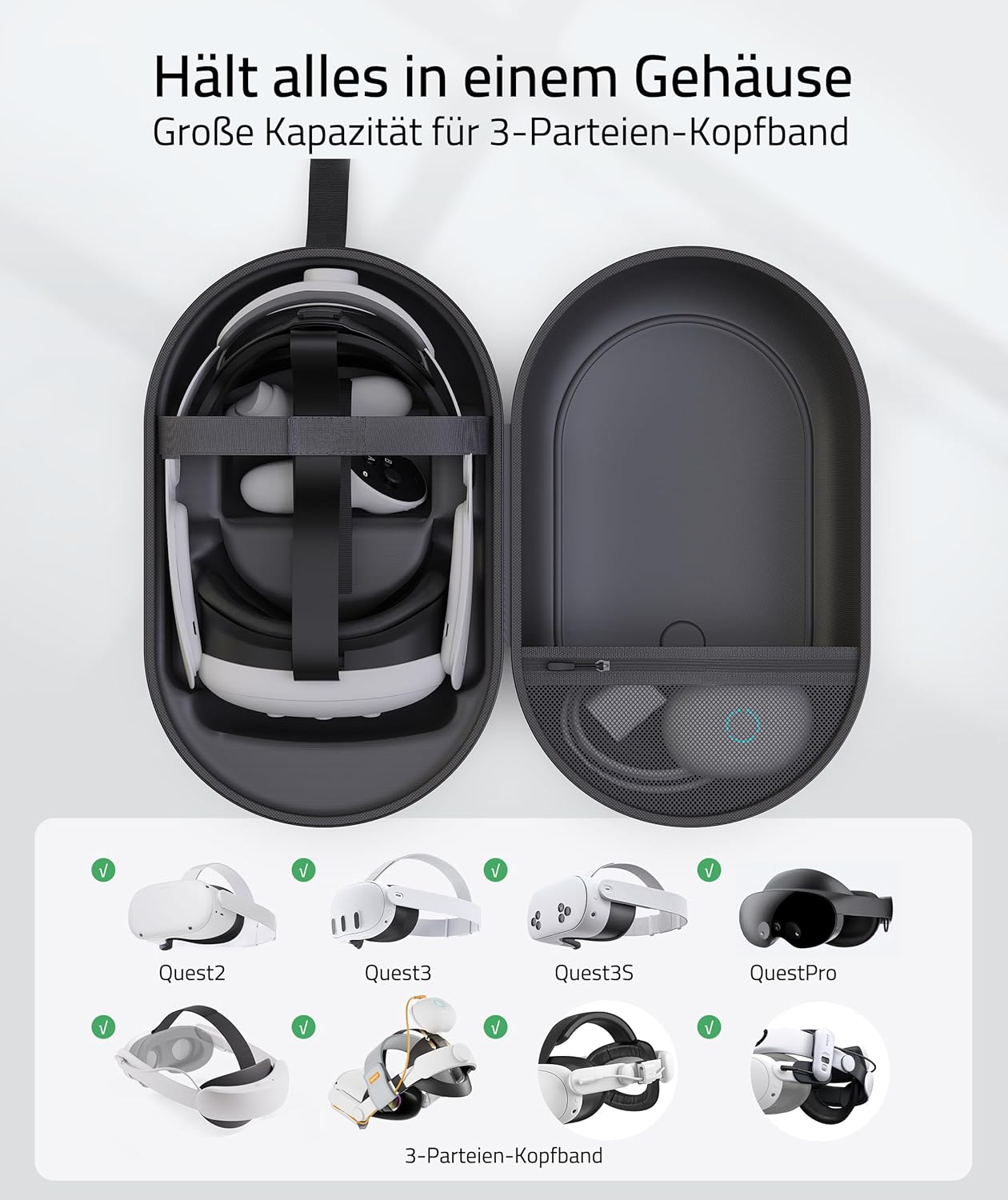 - Grösseres Fassungsvermögen: Es gibt viel Platz für die perfekte Kompatibilität mit Oculus/Meta Quest2/Quest3/Pro, PICO4/Pro/Enterprise und verschiedenen Arten von Quest3/Quest2-Kopfbändern von Drittanbietern/Aftermarket, zwei Touch-Controllern und