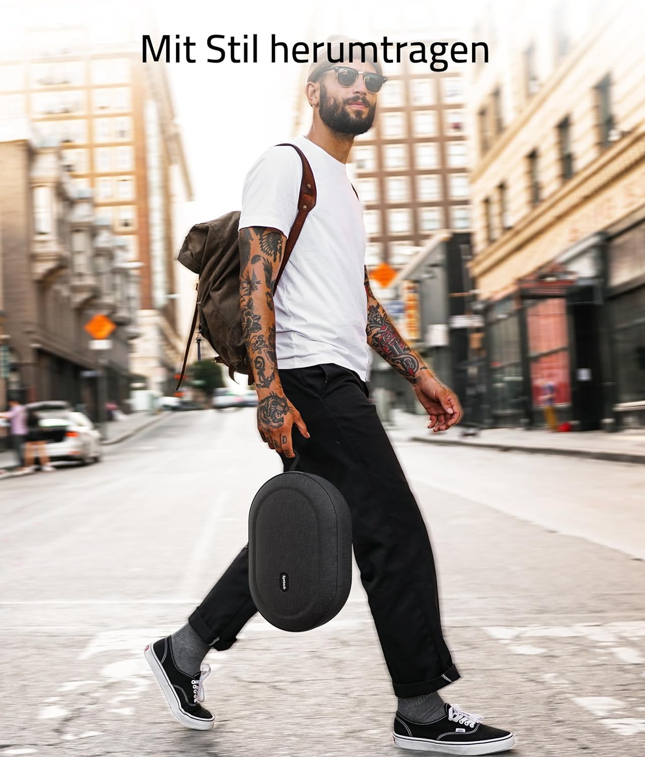 - Harte Schutzhülle: Dieses Etui ist von einem hochwertigen, spritzwassergeschützten Stoff umhüllt. Hinter dem eleganten Äusseren verbirgt sich eine EVA-Schale, die robust genug ist, um Stössen zu widerstehen und ihre ovale Form zu behalten.