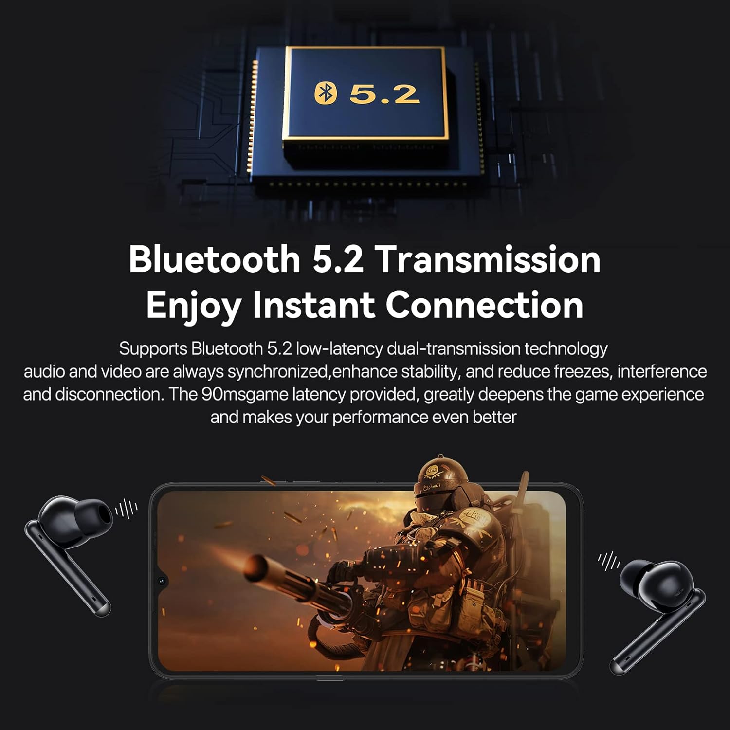 - 【Bluetooth 5.2 Chip】 Durch die Verwendung des fortschrittlichen Bluetooth 5.2-Chips und des Keramikantennendesigns kann das kabellose Headset eine stabilere und schnellere Übertragungsgeschwindigkeit bieten, sodass Sie selbst in Bereichen mit