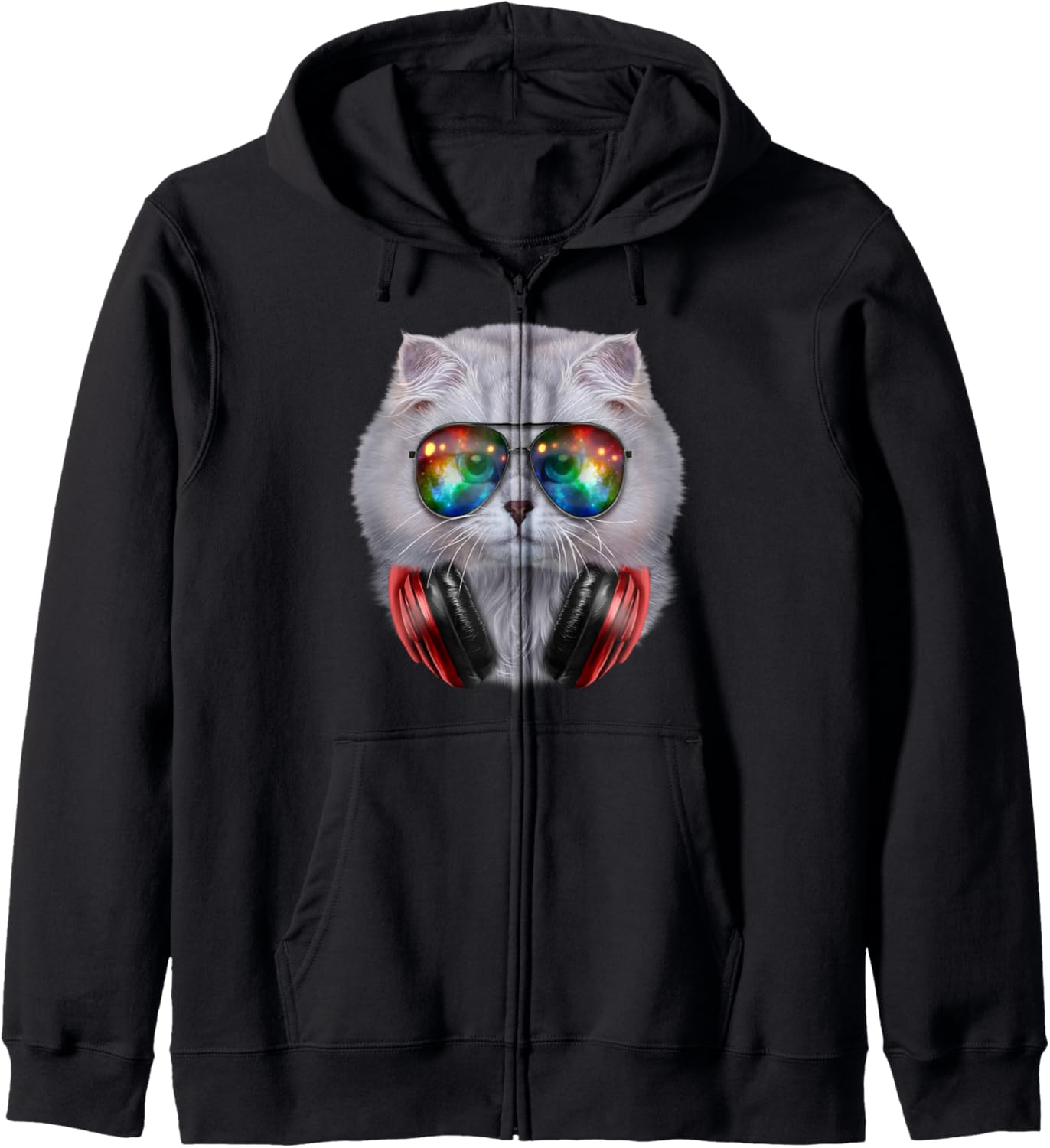 Weisse Katze, die Raumsonnenbrille und Kopfhörer trägt Kapuzenjacke