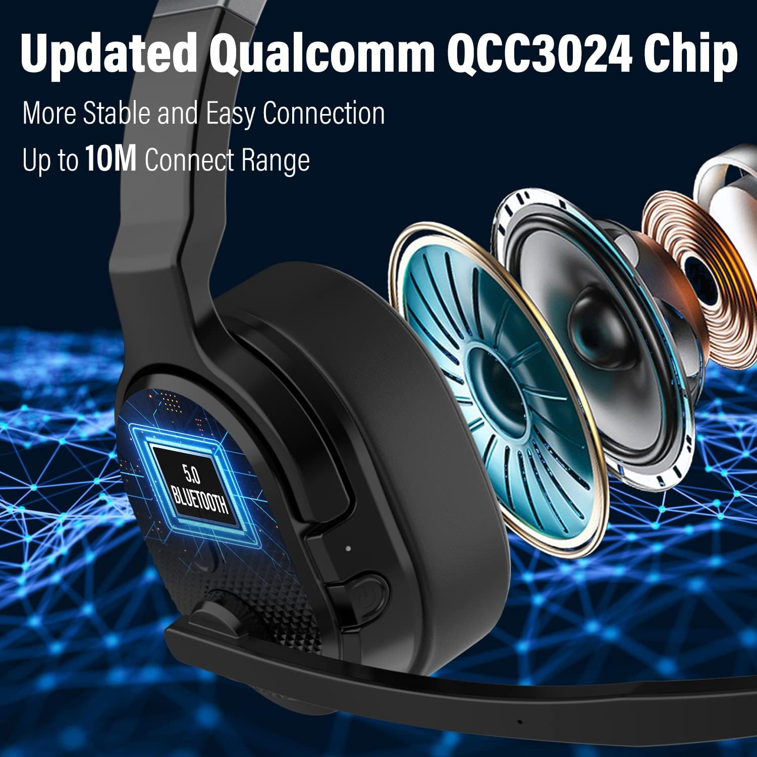 - [PREMIUM-KOMFORT ] Mit einem gepolsterten Kopfbügel und grossen, gepolsterten Ohrmuscheln ist unser Headset wireless mit Mikrofon für verbesserten Komfort für den ganztägigen Gebrauch konzipiert. Dies ist das ideale Bluetooth Kopfhörer mit Mikrofon