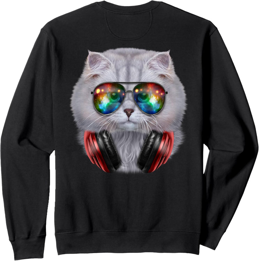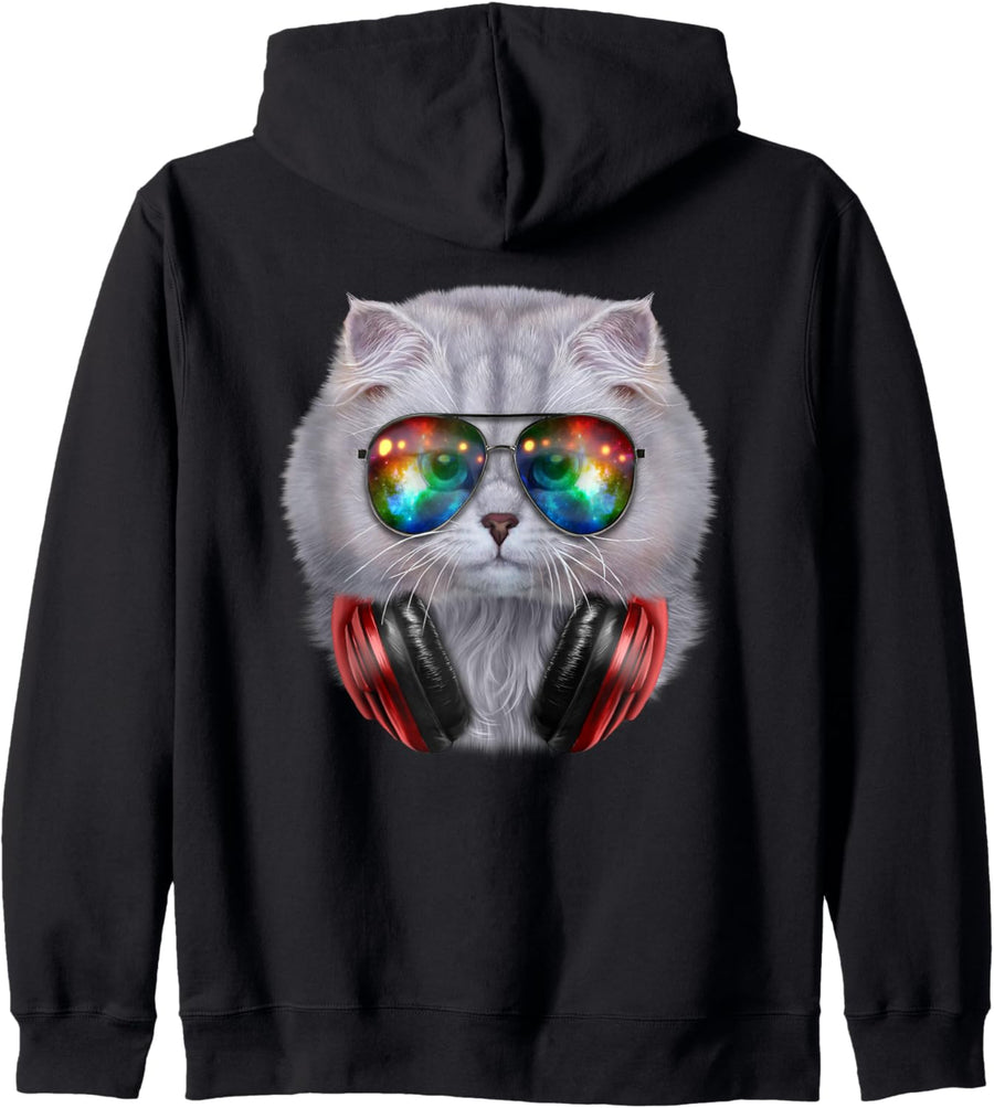 Weisse Katze, die Raumsonnenbrille und Kopfhörer trägt Pullover Hoodie
