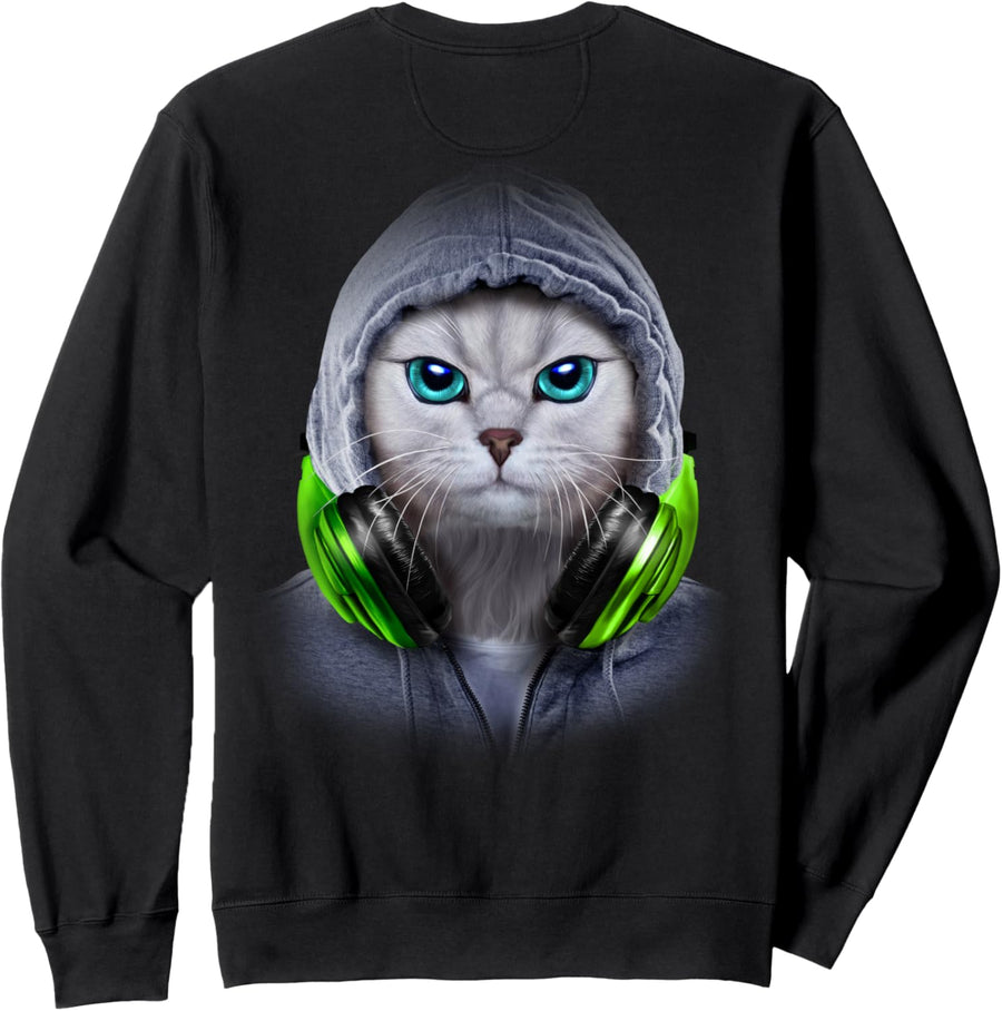 Weisse Katze in einem grauen Kapuzenpulli und Kopfhörern Sweatshirt