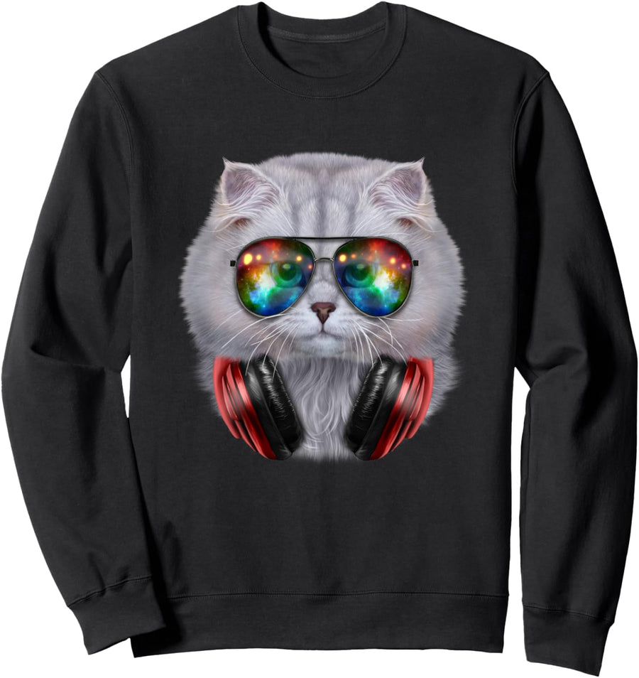 Weisse Katze, die Raumsonnenbrille und Kopfhörer trägt Sweatshirt