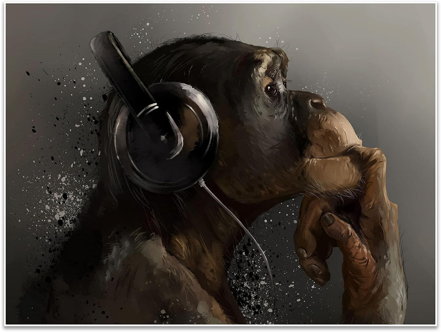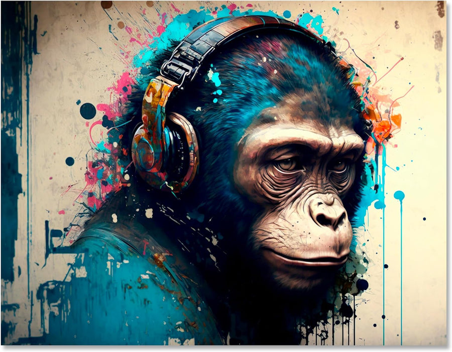 wandmotiv24 Poster als Wanddeko, Grösse 80x60cm, AFFE mit Kopfhörer, Headset, Musik, Tiere, Affen, M