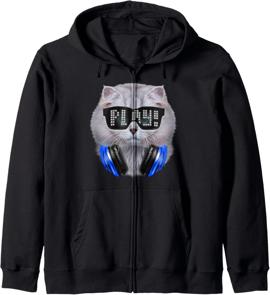 Weisse Katze in einem dunklen Kapuzenpulli und Kopfhörern Sweatshirt