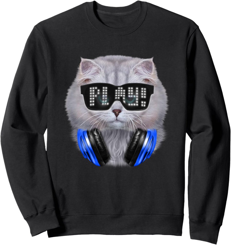 Weisse Katze, die Hipster-Sonnenbrille und Kopfhörer trägt Sweatshirt