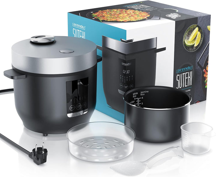 - GROssER FUNKTIONSUMFANG: Eleganter 2 Liter Reiskocher SUTEKI, Leistung 350 Watt | Digital-Display mit Restzeitanzeige (10 min. vor Fertigstellung) und Warmhaltezeit | beidseitig antihaftbeschichteter Kochtopf | Mikrodruckventil | Dual-Temperatursensor für gleichmässige Erhitzung | 24-Stunden-Timer | 5 Programme plus Warmhaltefunktion | Status-LEDs | Summer | Anti-Rutsch-Füsse | praktische Tragegriffe | Thermosicherung