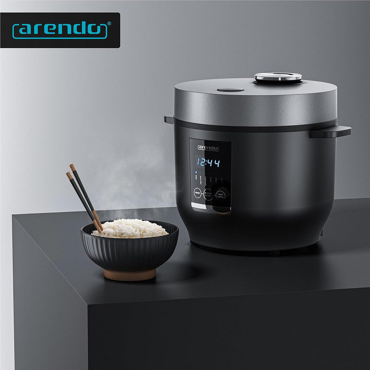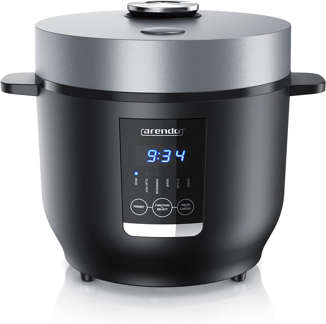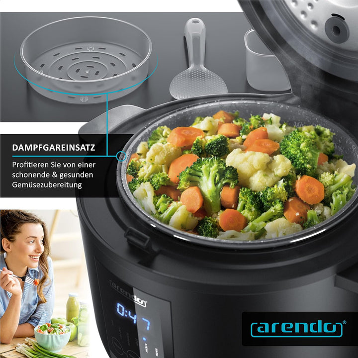 - PROFESSIONELLER REISKOCHER: super schnell, super einfach und super lecker. Der 2 Liter Reiskocher von Arendo bereitet jede Reissorte auf den Punkt zu. Ideal für weissen und roten Reis, für Naturreis und Sushi. Temperatursensoren ober- und unterhalb des Kochgefässes garantieren eine gleichmässige Erhitzung. Mit 5 Kochprogrammen: Reis, Haferbrei, Römertopf, Dampfgaren, Suppen | Inklusive Dampfgareinsatz, Messbecher und Reislöffel. | BPA-frei | 305598